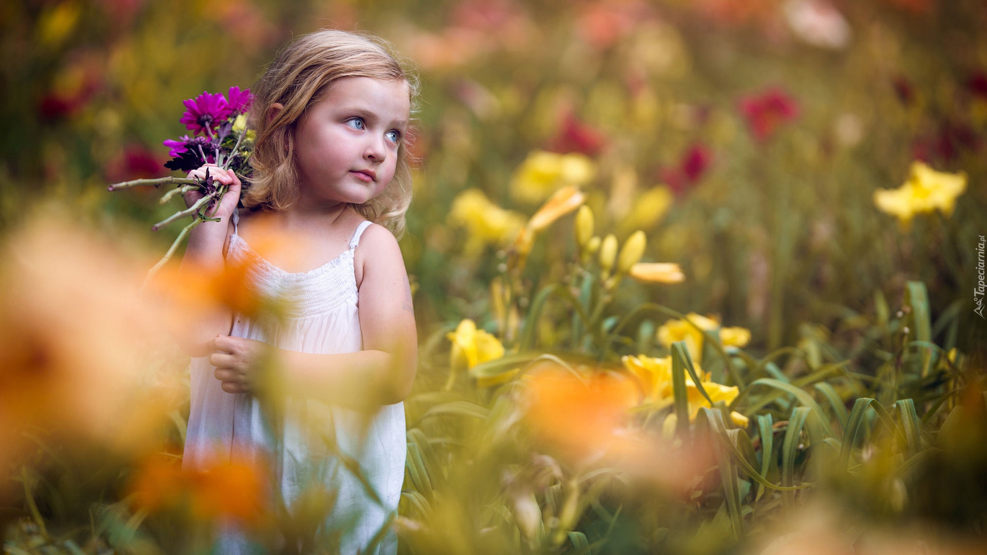 Edytor tapety: Dziewczynka z bukietem kwiatów na kwiecistej łące