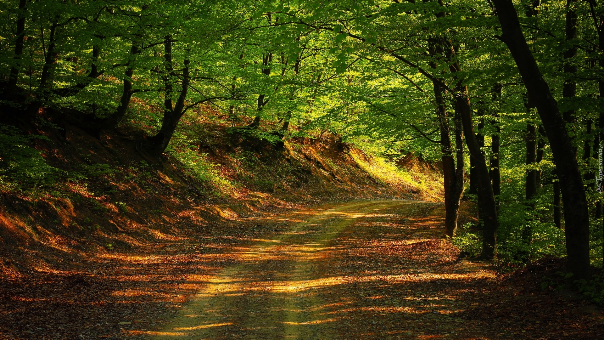 Edytor tapety: Słońce zerka na leśną drogę wśród drzew