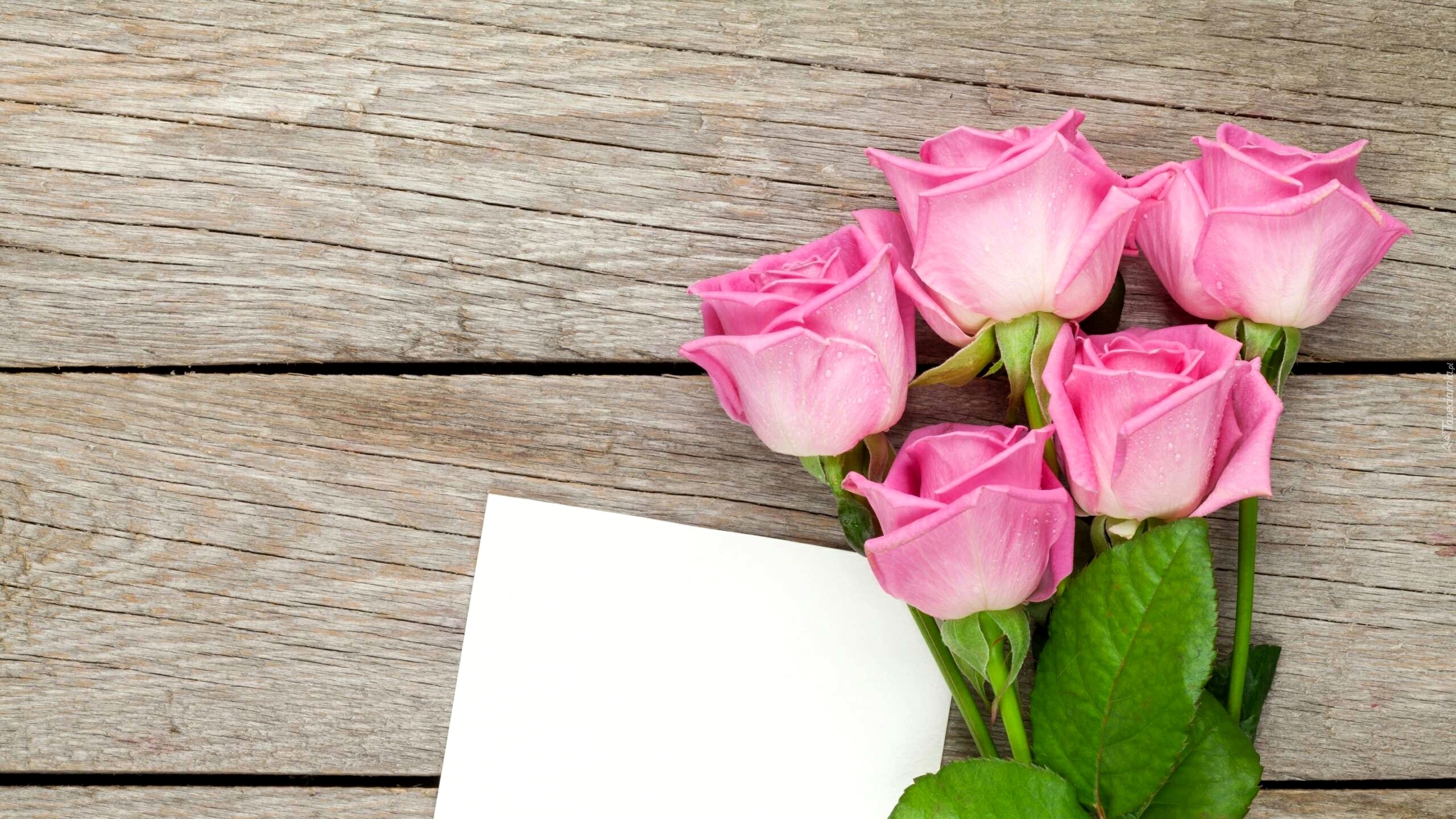Edytor tapety: Pięć różowych róż na deskach obok kartki