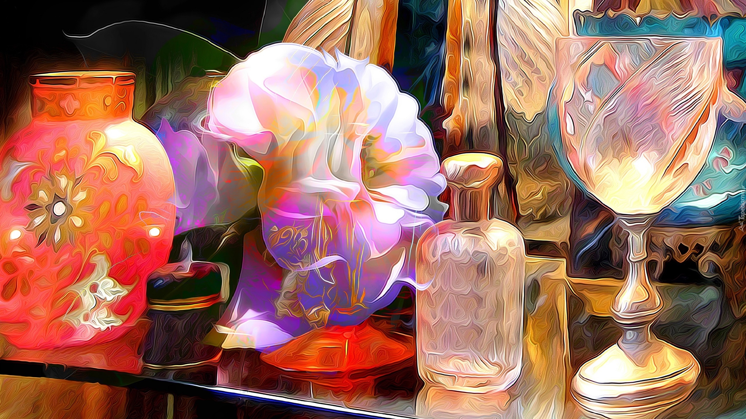 Edytor tapety: Grafika fractalius z butelką, kieliszkiem i wazonem