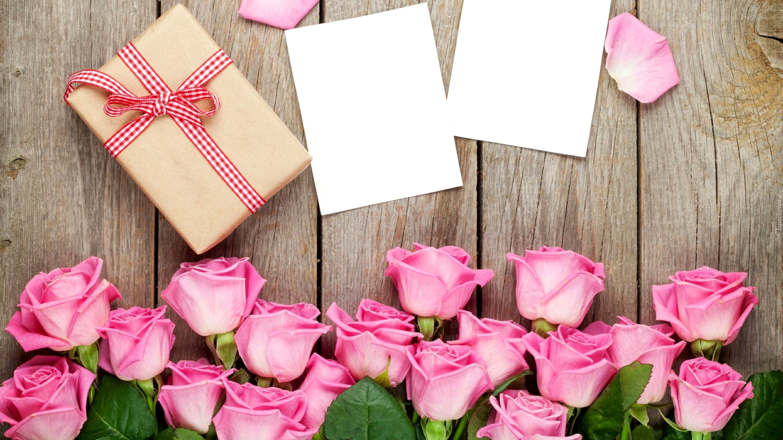 Edytor tapety: Różowe róże obok prezentu i pustych kartek