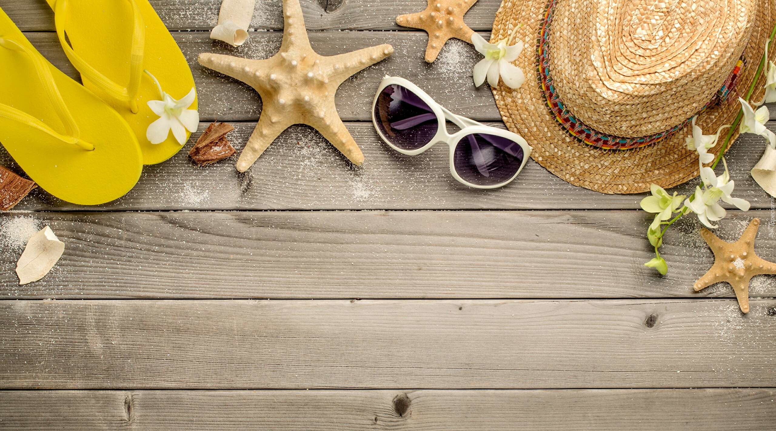 Edytor tapety: Wakacyjne gadżety położone na drewnianym blacie