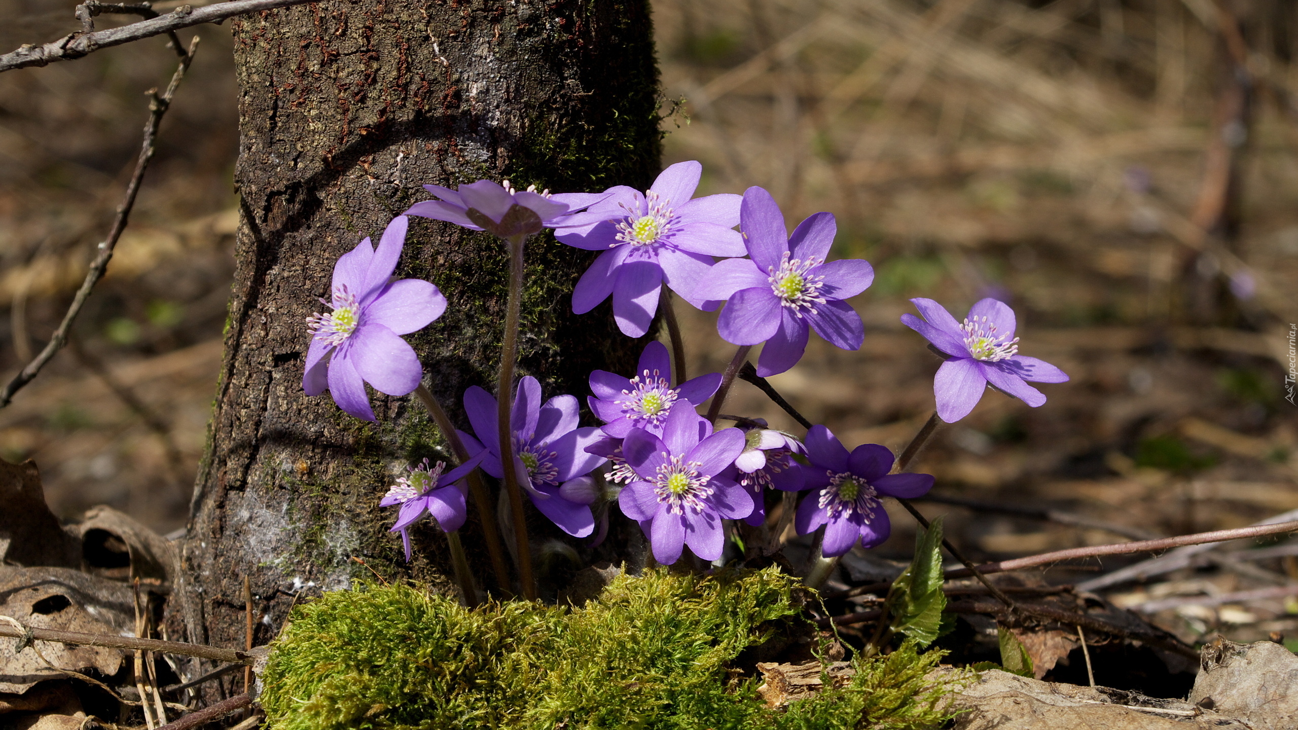 Edytor tapety: Fioletowe przylaszczki zakwitły na mchu przy drzewie