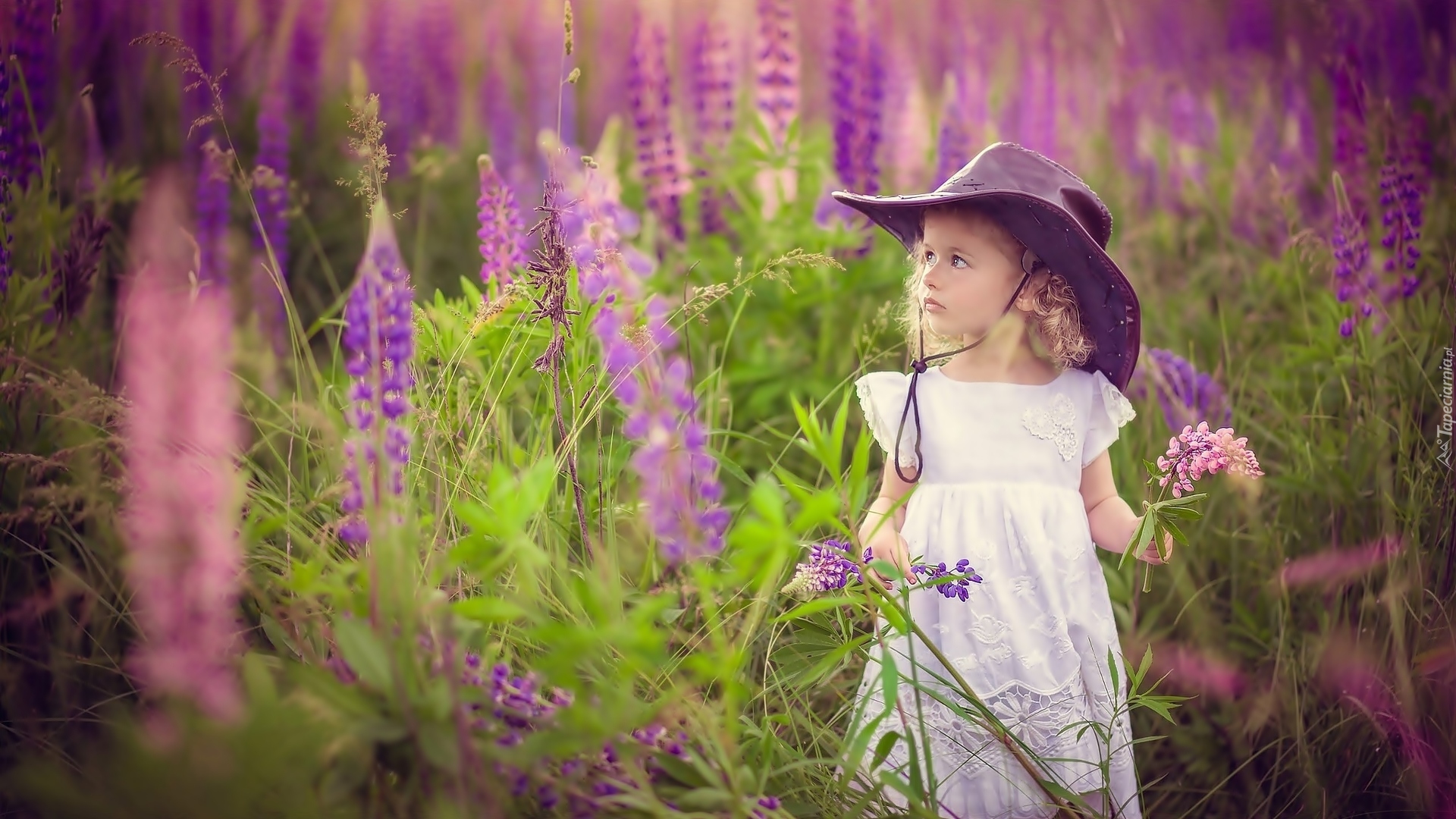 Edytor tapety: Dziewczynka w kowbojskim kapeluszu na łubinowej łące