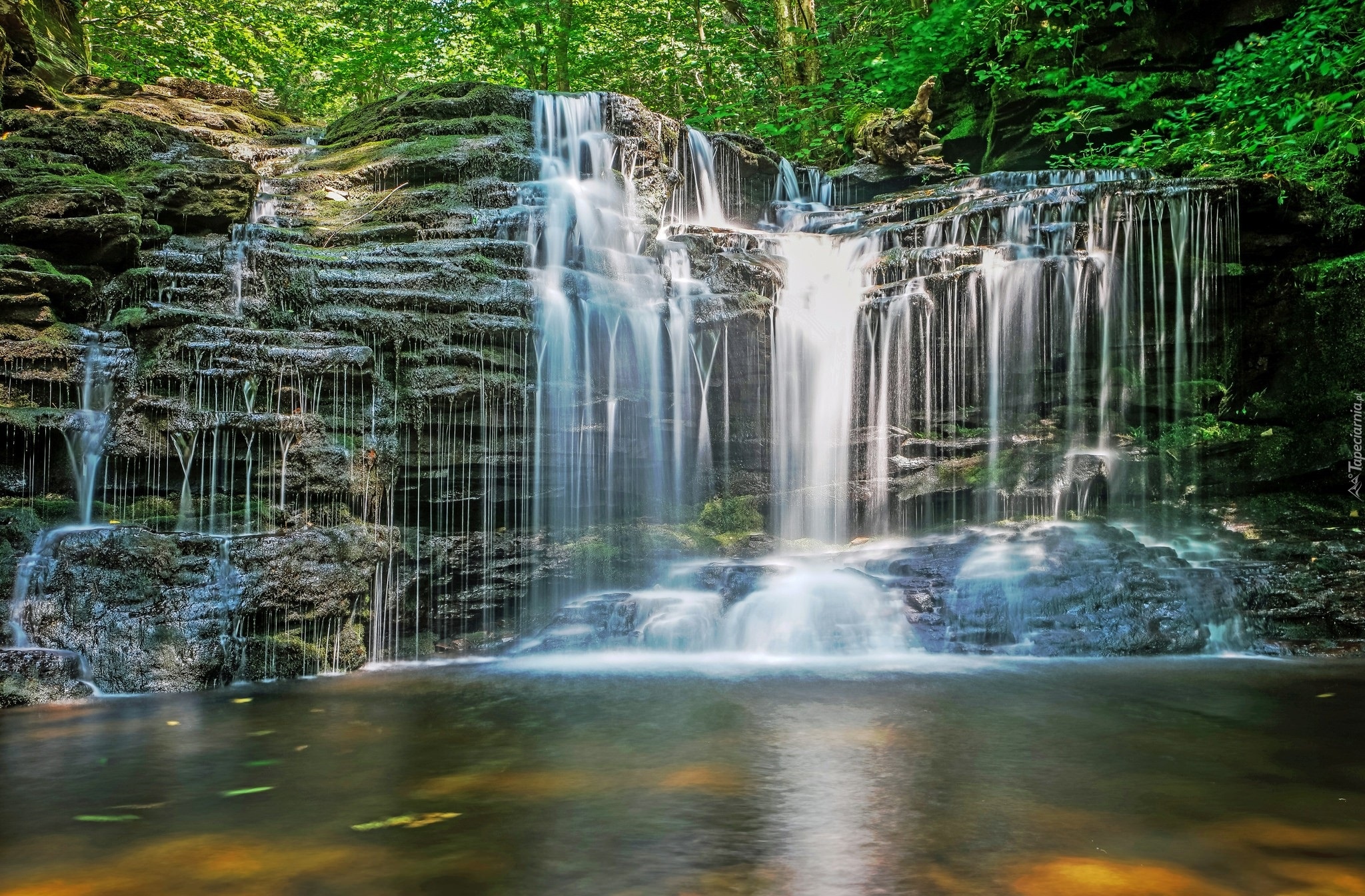 Edytor tapety: Leśny wodospad spływający po skałach do rzeki
