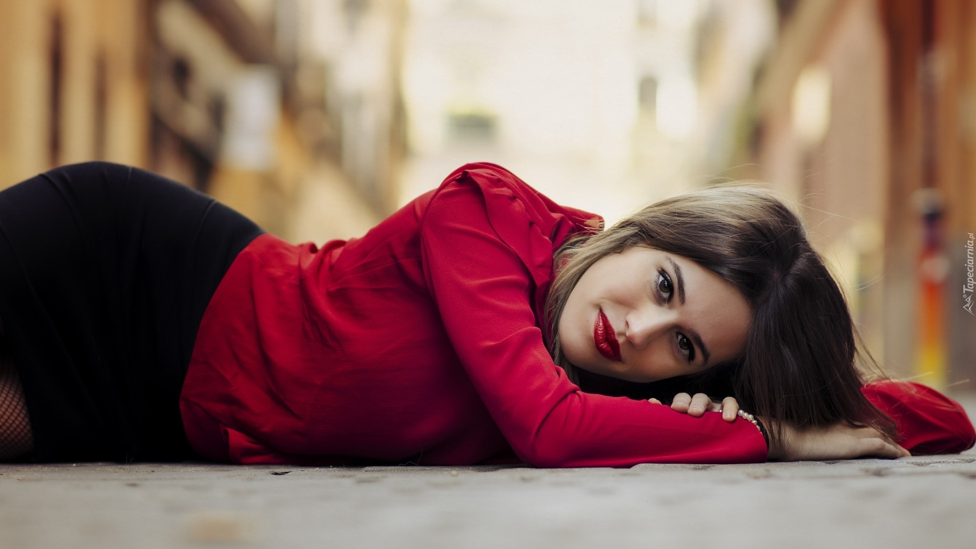 Edytor tapety: Szatynka w czerwonej bluzce leży na chodniku