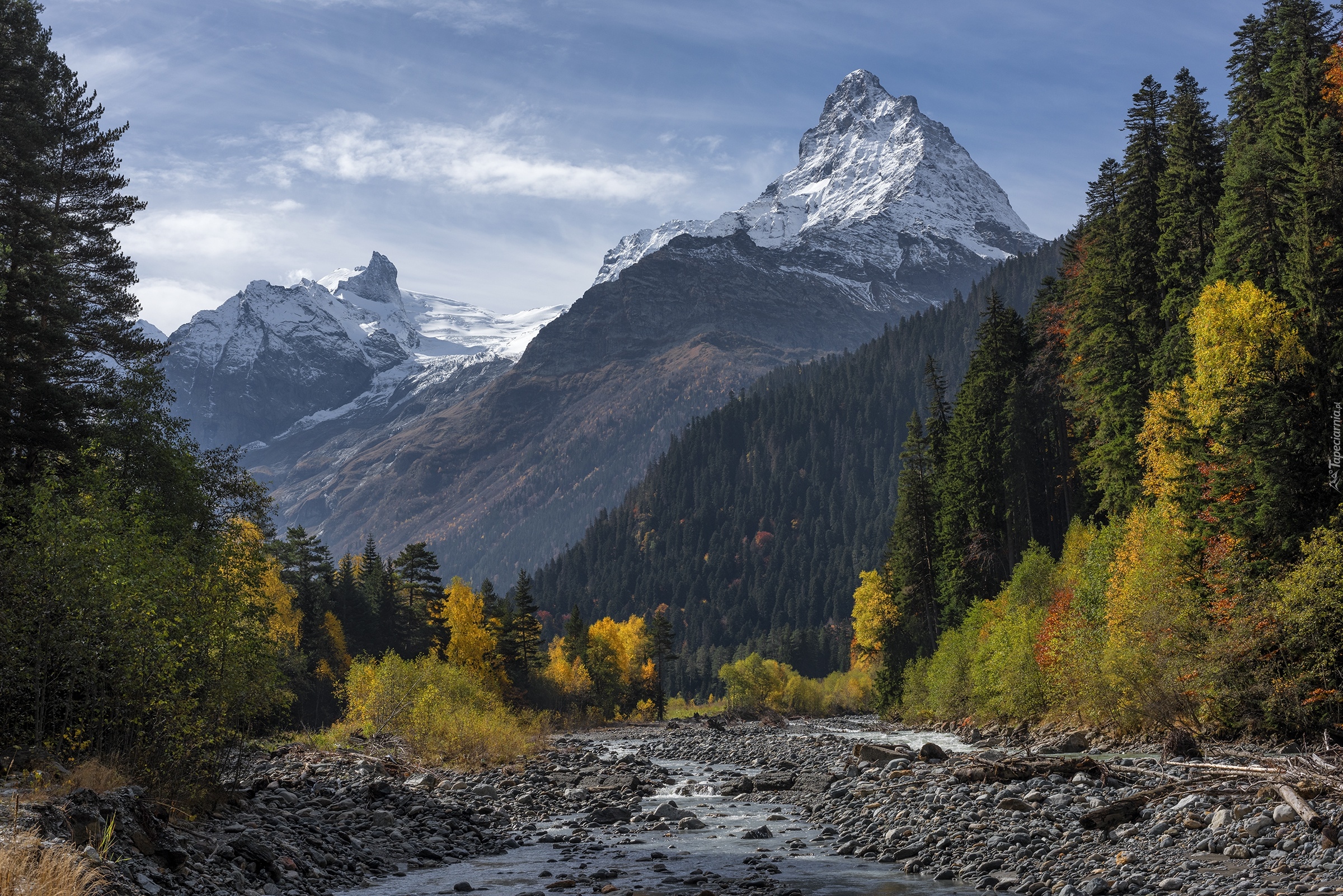 Edytor tapety: Rzeka i las u podnóża gór