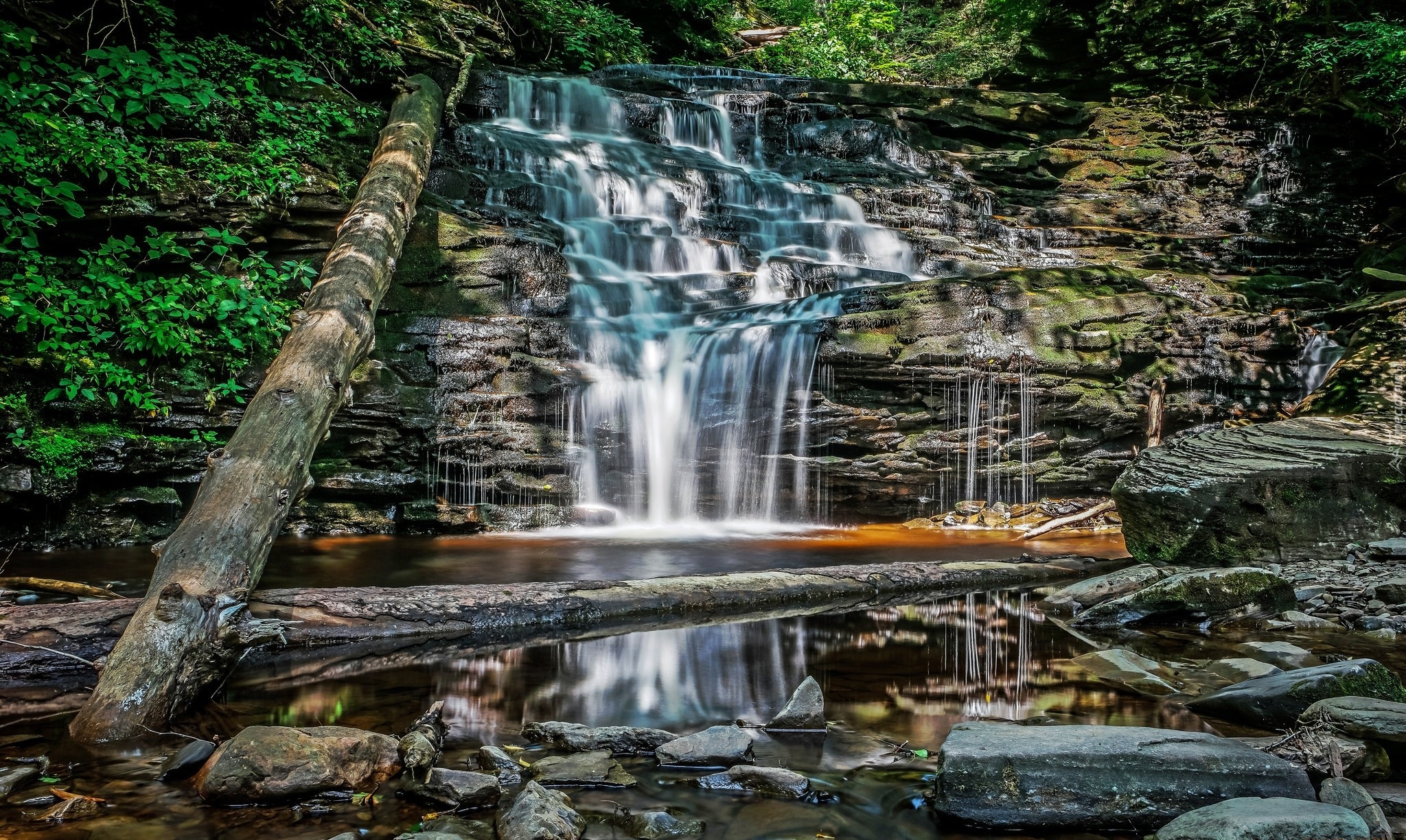 Edytor tapety: Wodospad na skałach i zwalone pnie