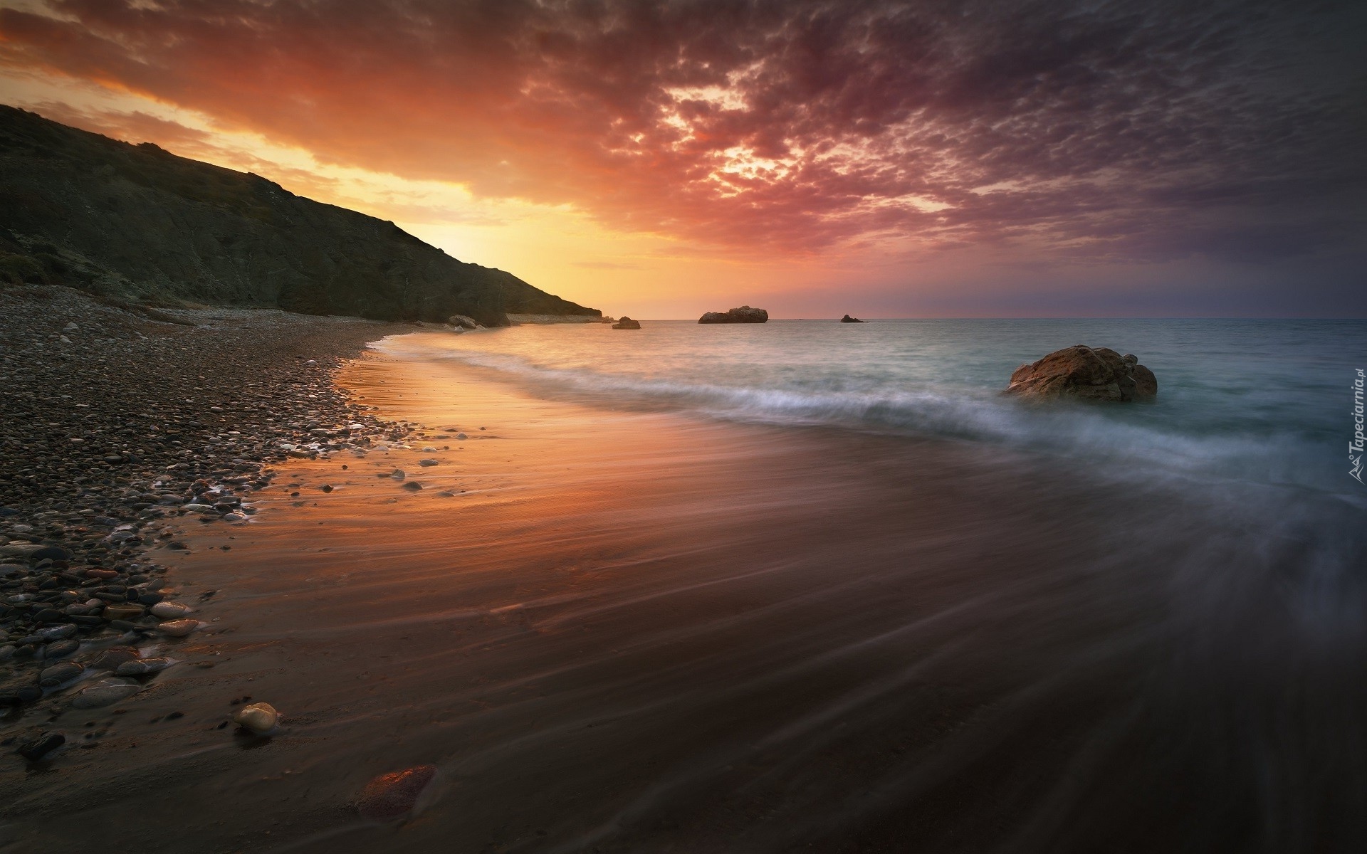 Edytor tapety: Kamienista plaża na Cyprze o zachodzie słońca