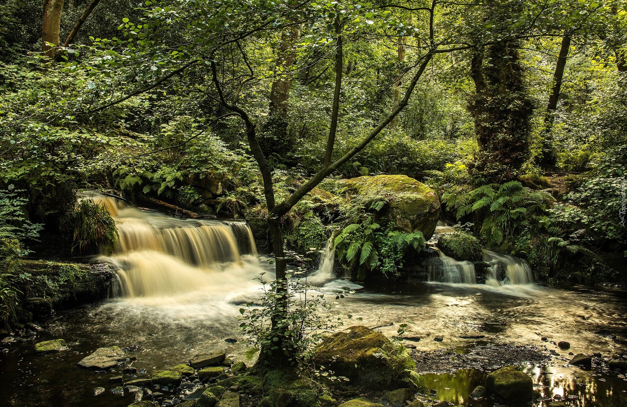 Edytor tapety: Leśny wodospad spływający po kamieniach między roślinami