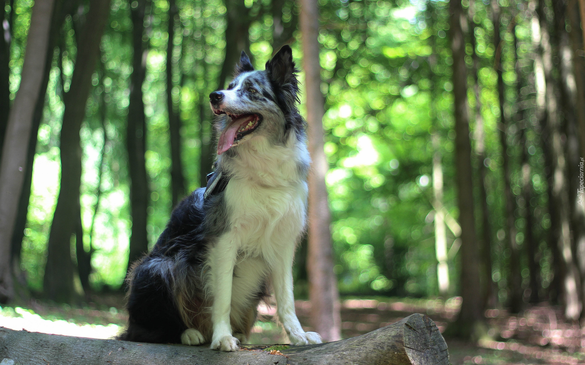 Edytor tapety: Zdyszany border collie na kłodzie drzewa w lesie