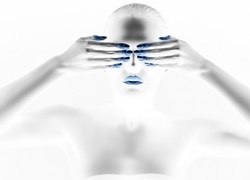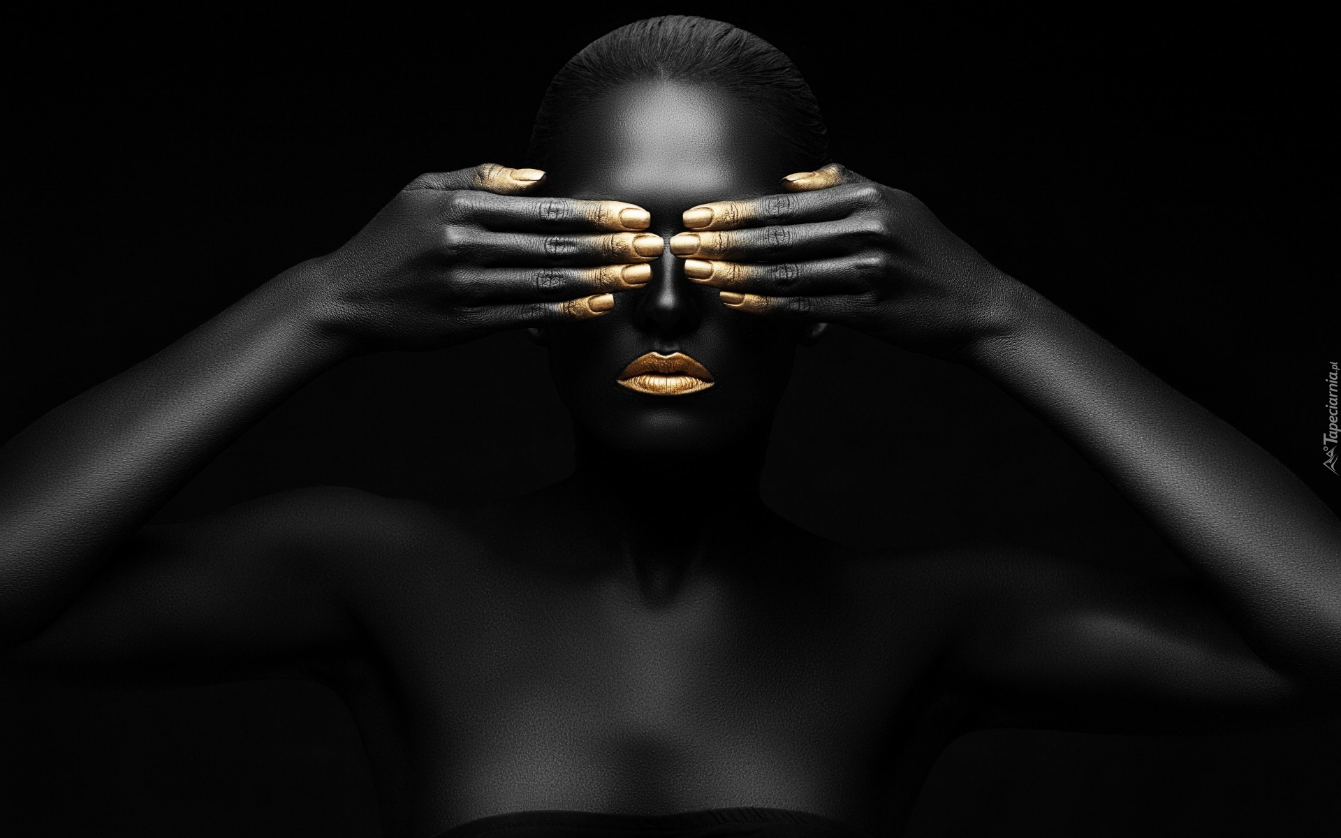 Edytor tapety: Kobieta w złotym makijażu zasłania twarz dłońmi