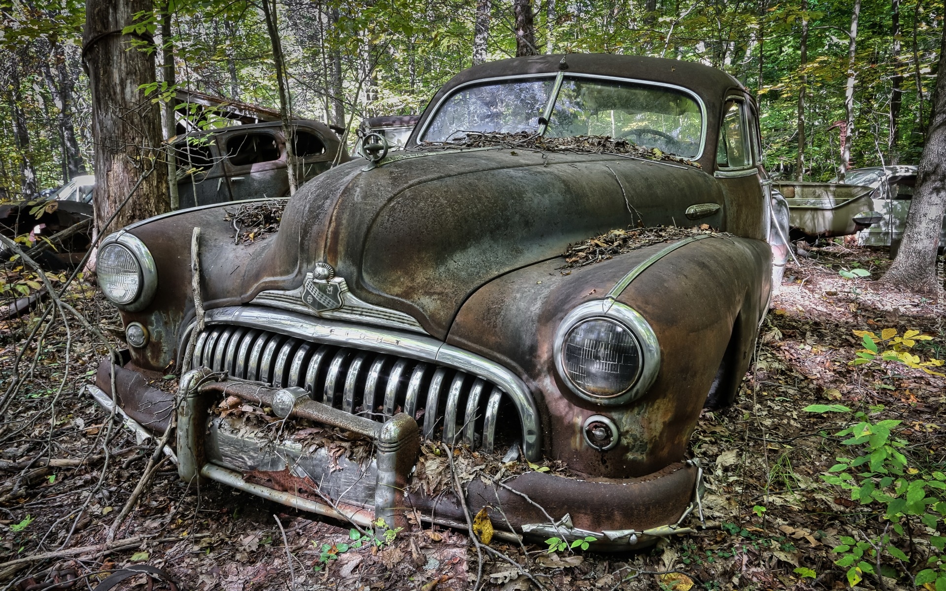 Edytor tapety: Zezłomowany Buick w lesie