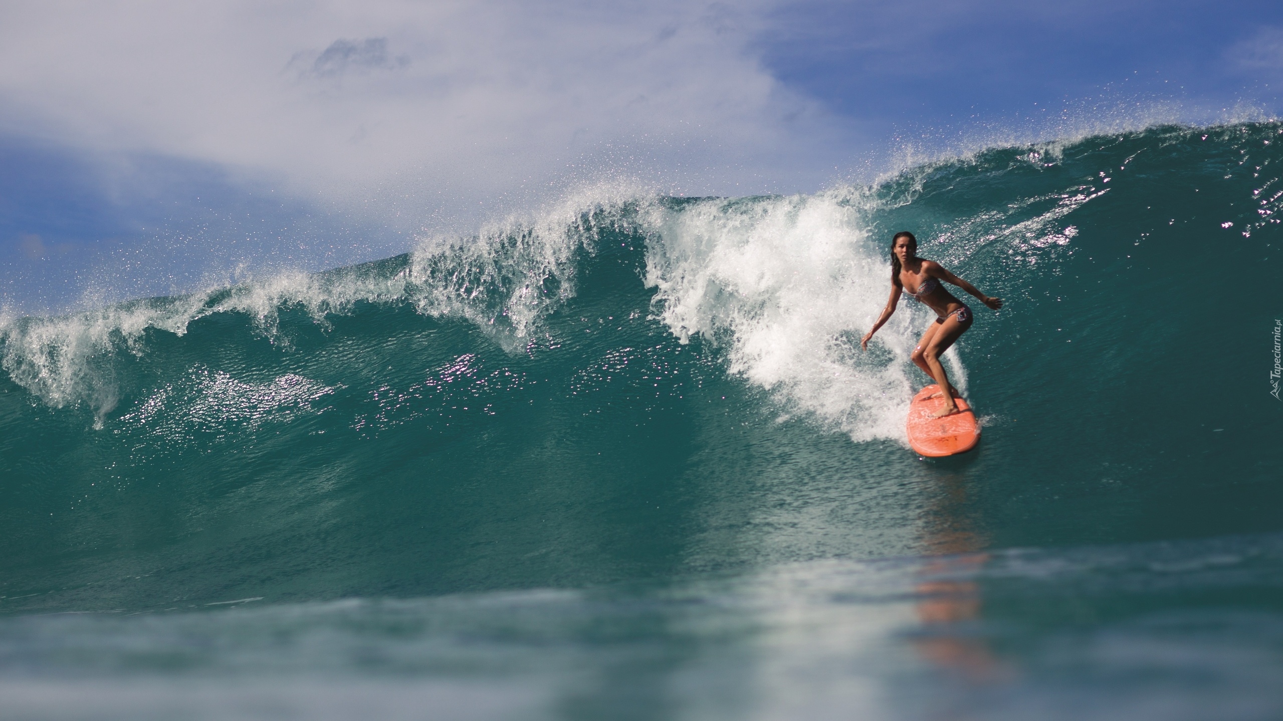 Edytor tapety: Kobieta na desce windsurfingowej pokonuje fale