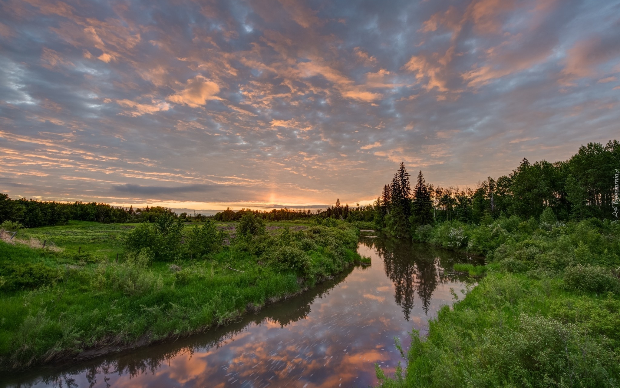 Edytor tapety: Chmury nad rzeką i drzewami o zachodzie słońca