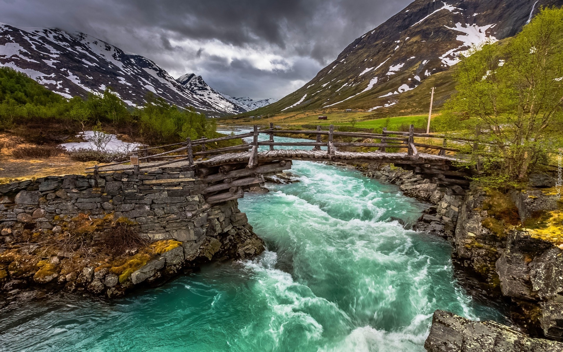 Edytor tapety: Drewniany mostek nad rwącą rzeką w ośnieżonych górach