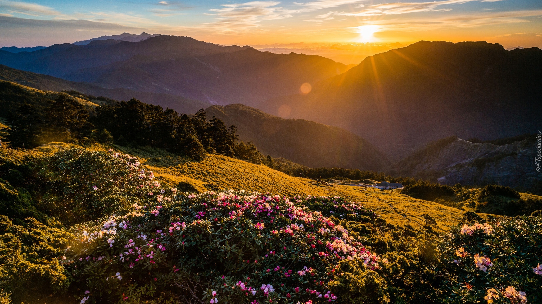 Edytor tapety: Górska dolina i kwitnące różaneczniki oświetlone promieniami słońca