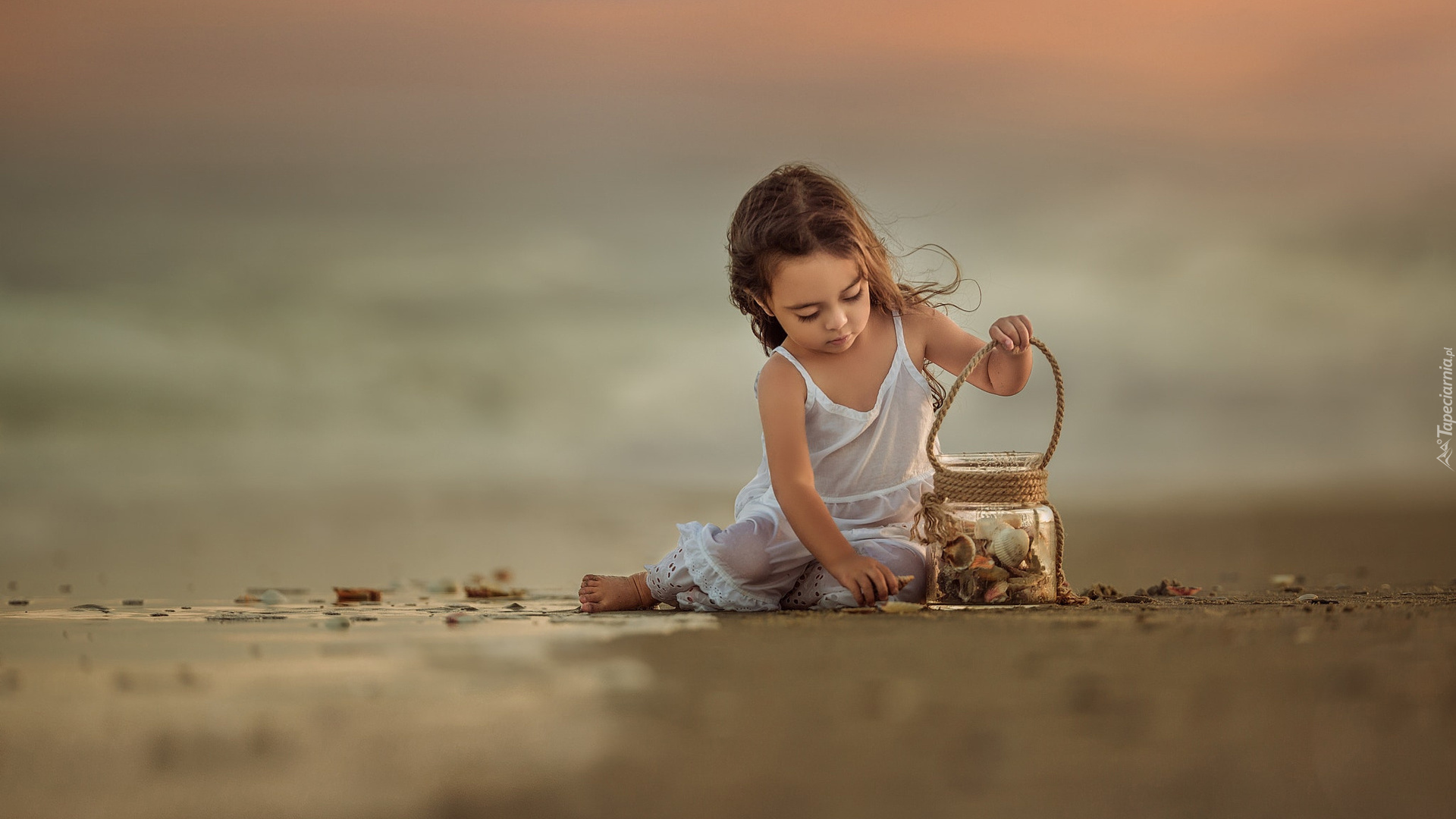 Edytor tapety: Dziewczynka zbiera na plaży muszelki do słoika