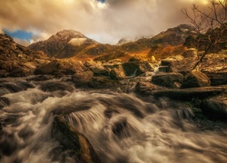 Edytor tapety: Rwącą kamienista rzeka w górach