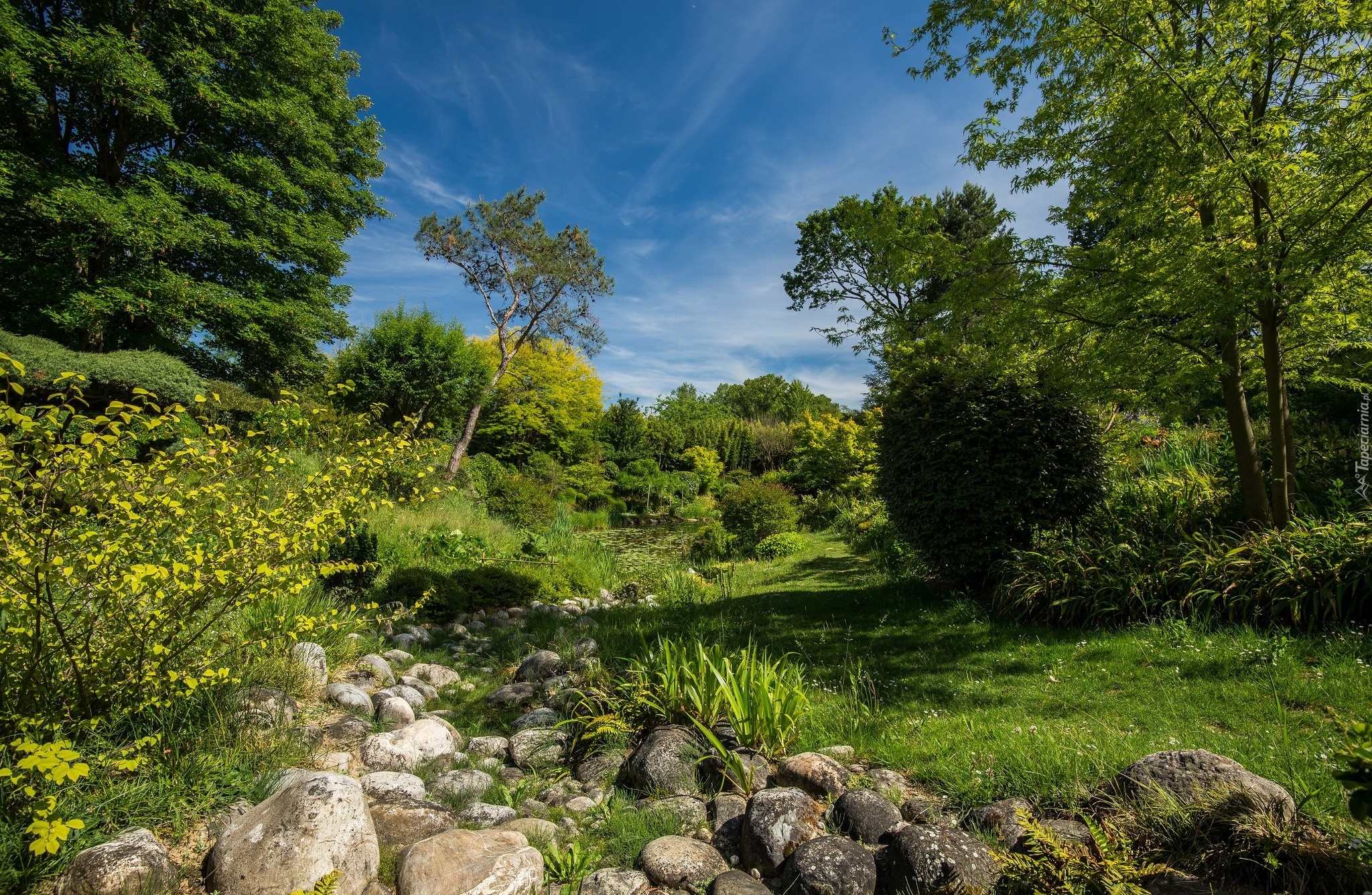 Edytor tapety: Kamienie i drzewa nad rzeczką w wiosenny dzień