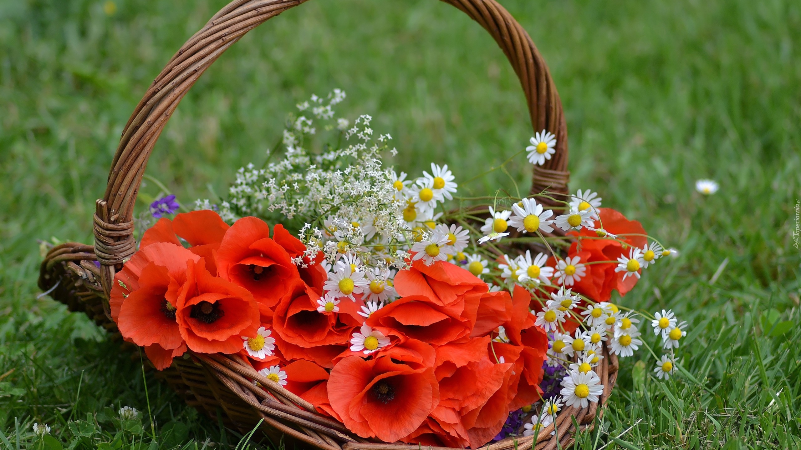 Edytor tapety: Kosz z bukietem maków i rumianków na łące