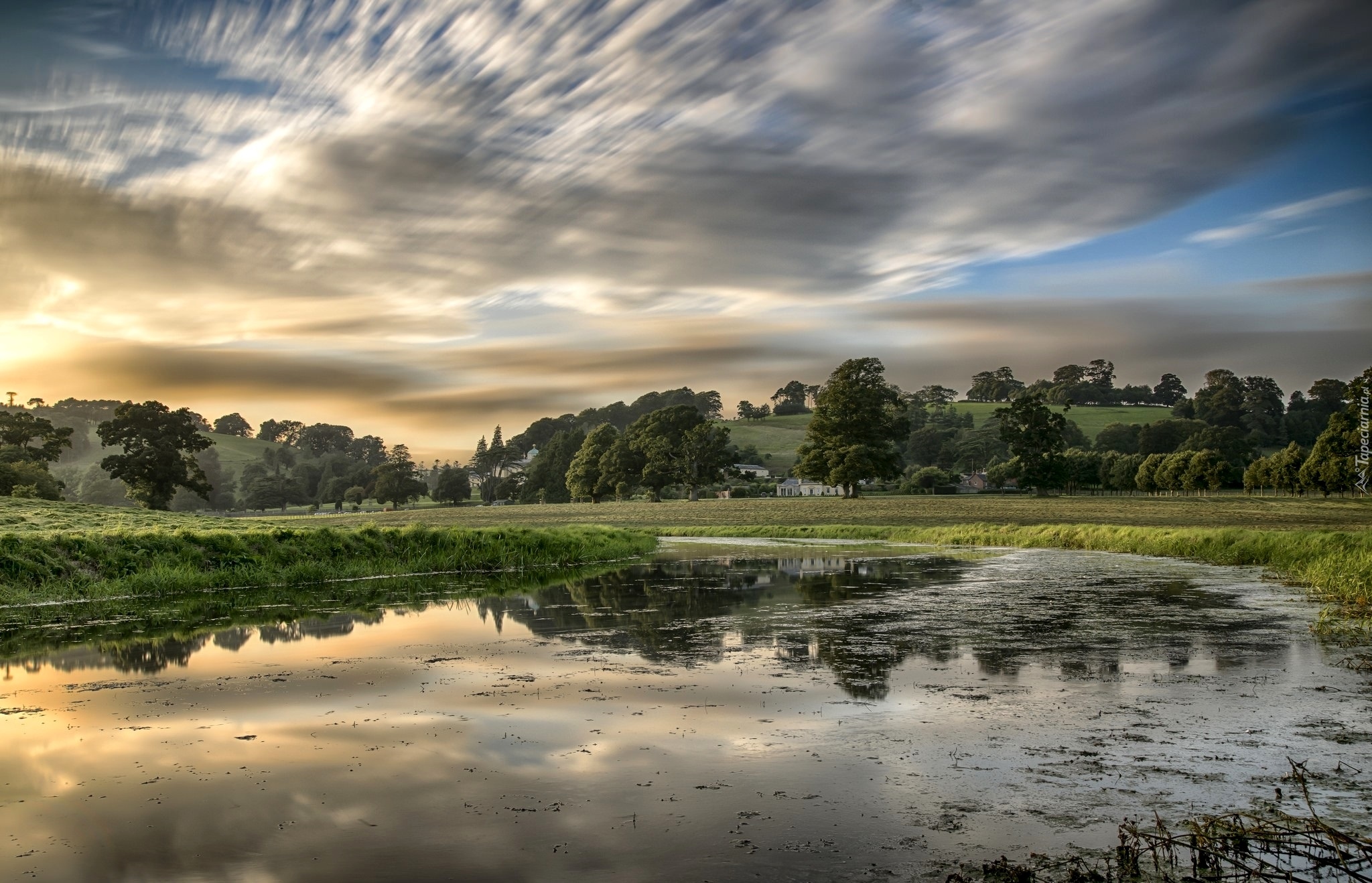 Edytor tapety: Ciemne chmury nad wzgórzami i rzeką