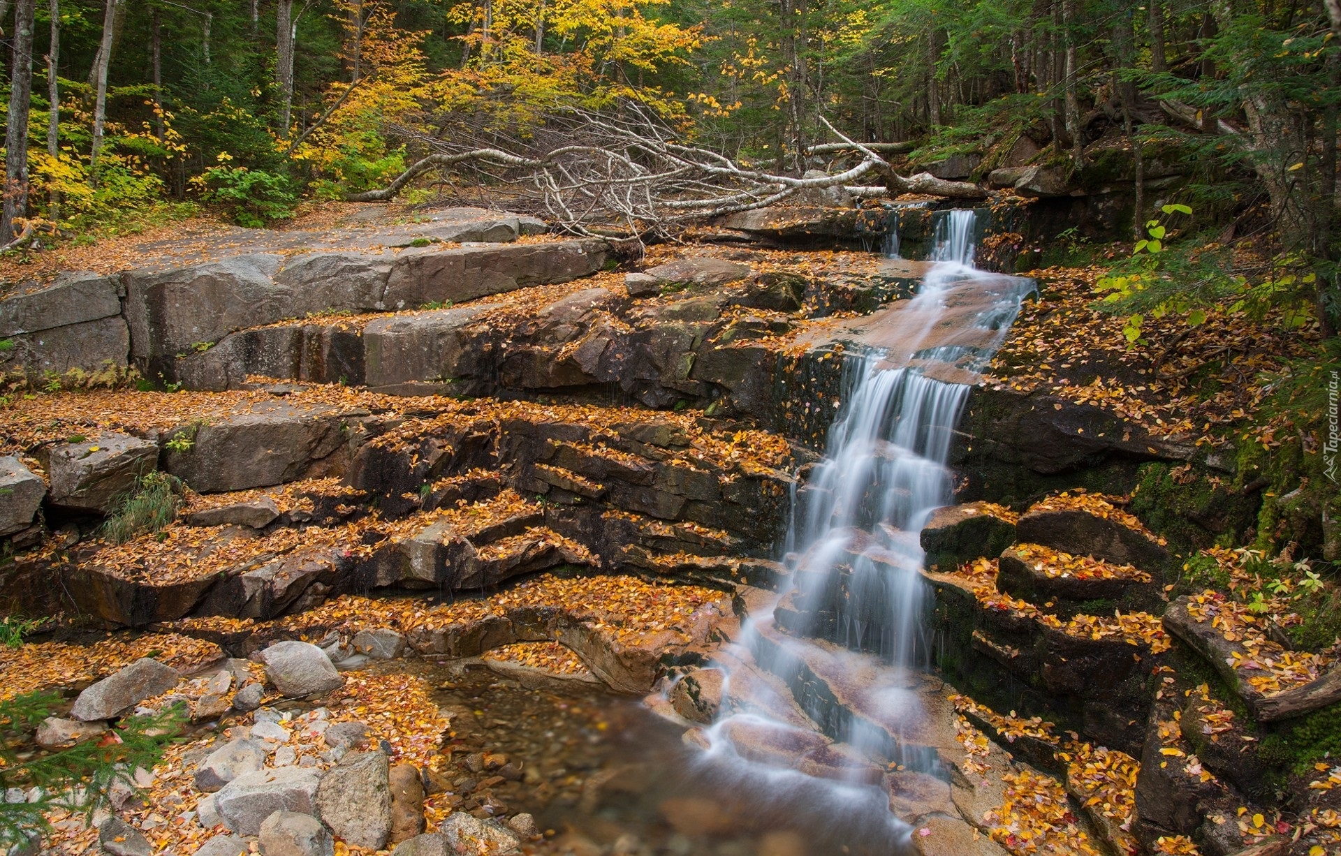 Edytor tapety: Wodospad spływający po kamieniach pokrytych jesiennymi liśćmi