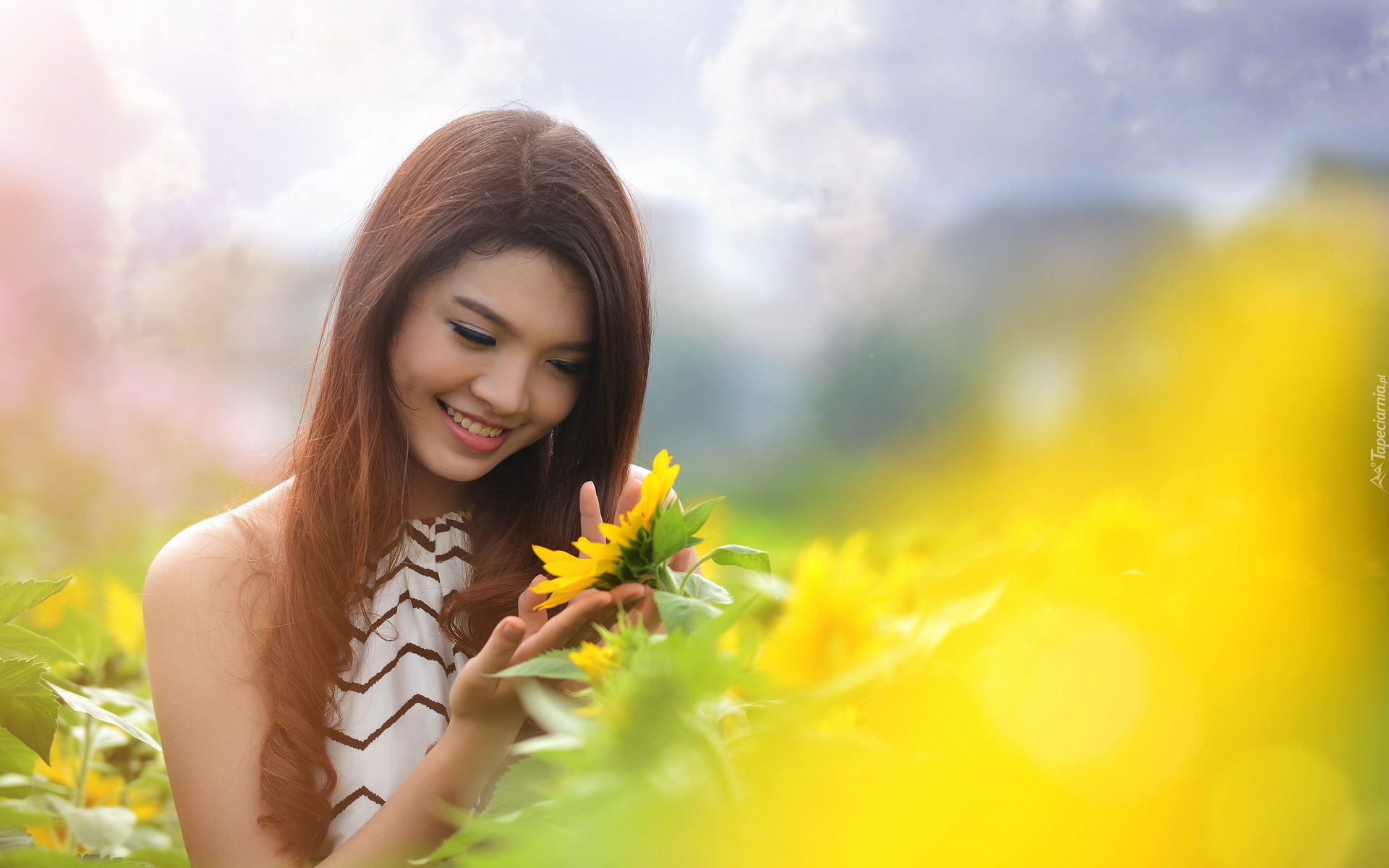 Edytor tapety: Uśmiechnięta dziewczyna pośród słoneczników w rozmyciu