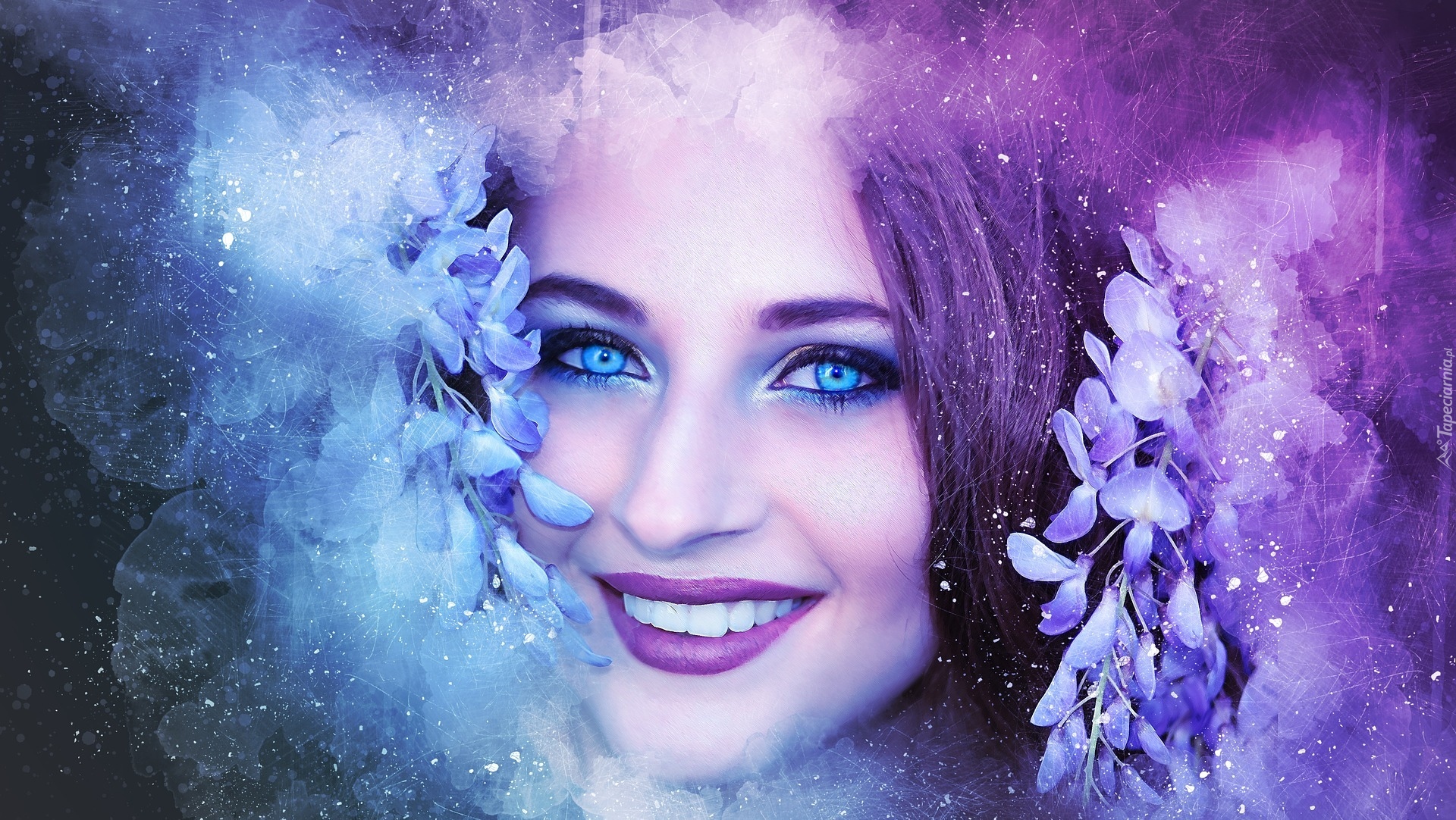 Edytor tapety: Uśmiechnięta twarz kobiety o niebieskich oczach