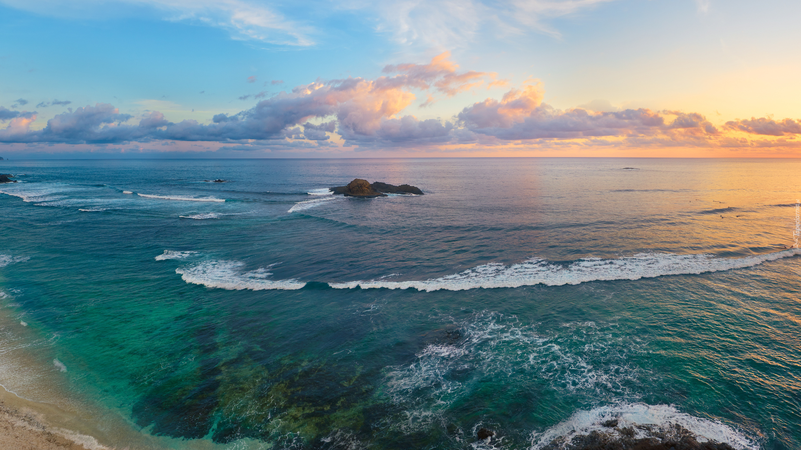 Edytor tapety: Skalna wysepka na morzu w blasku wschodzącego słońca