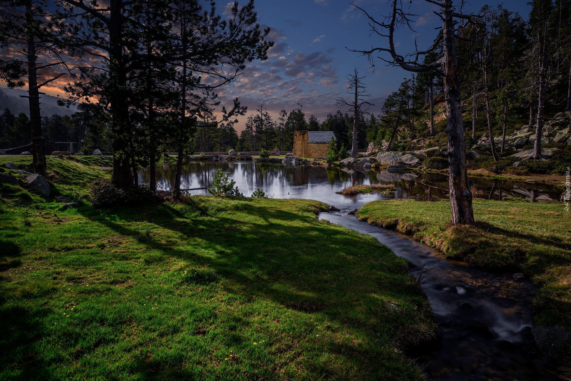 Edytor tapety: Murowany budynek i kamienie nad leśnym strumykiem