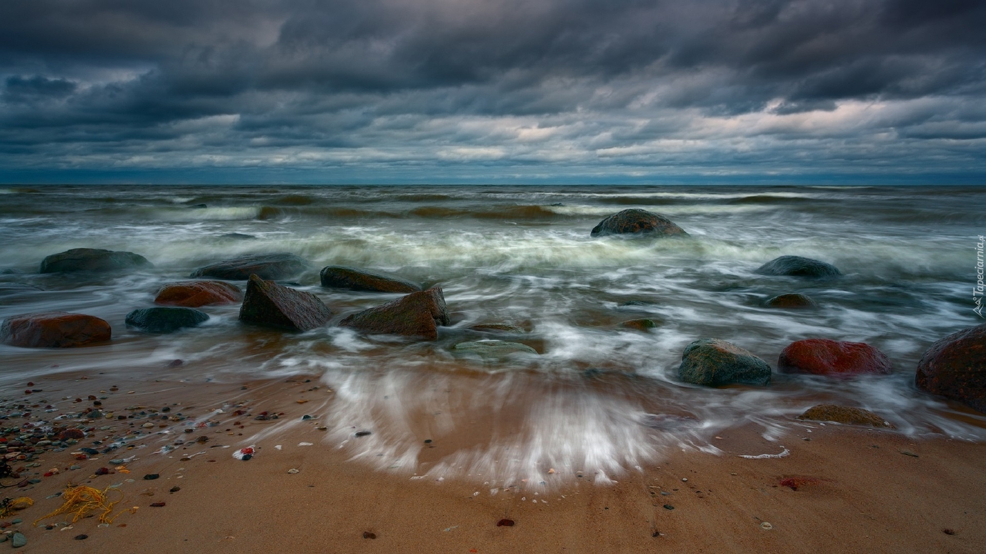 Edytor tapety: Kamienie na plaży obmywane przez morskie fale