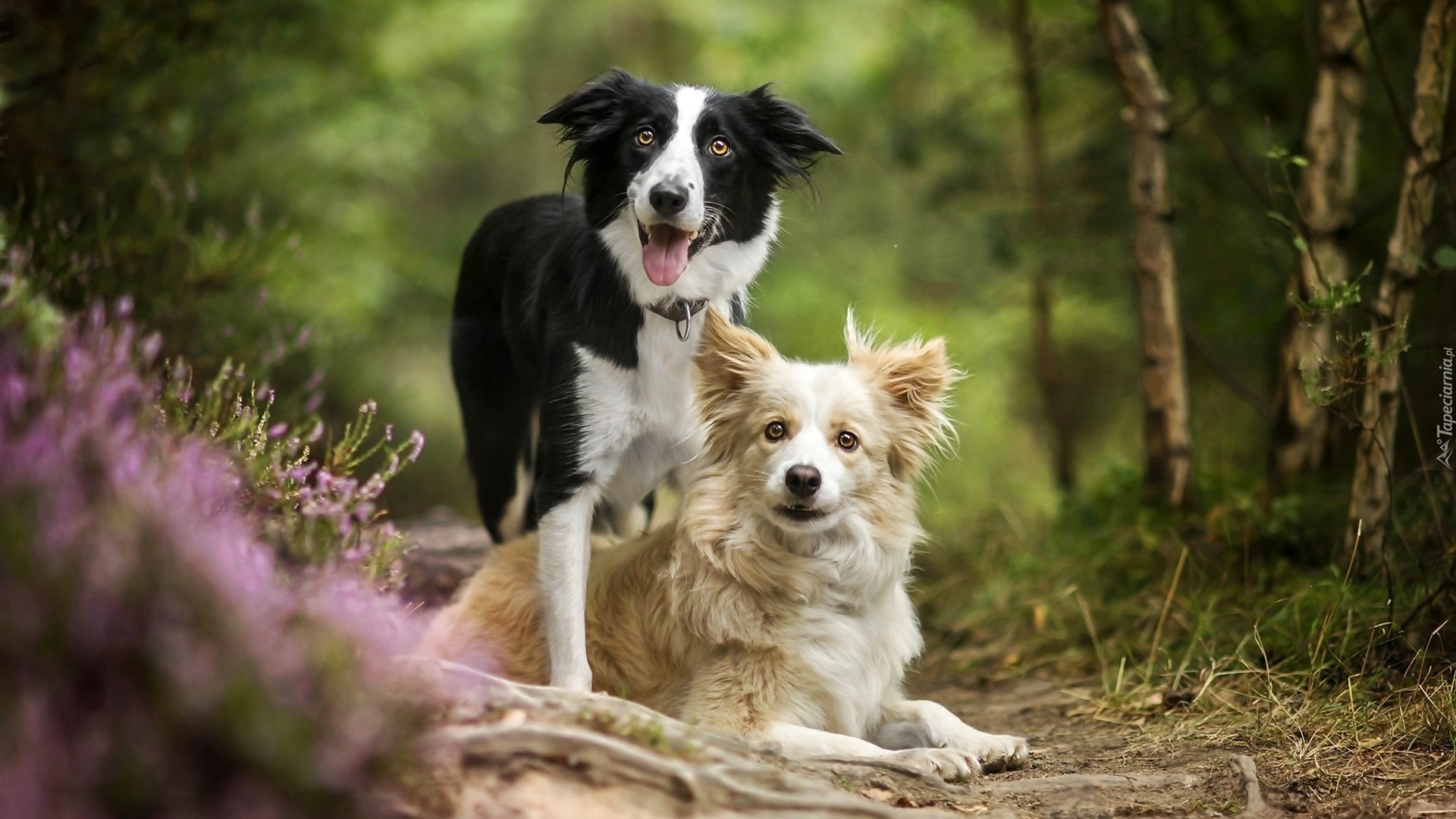 Edytor tapety: Dwa border collie na leśnej ścieżce