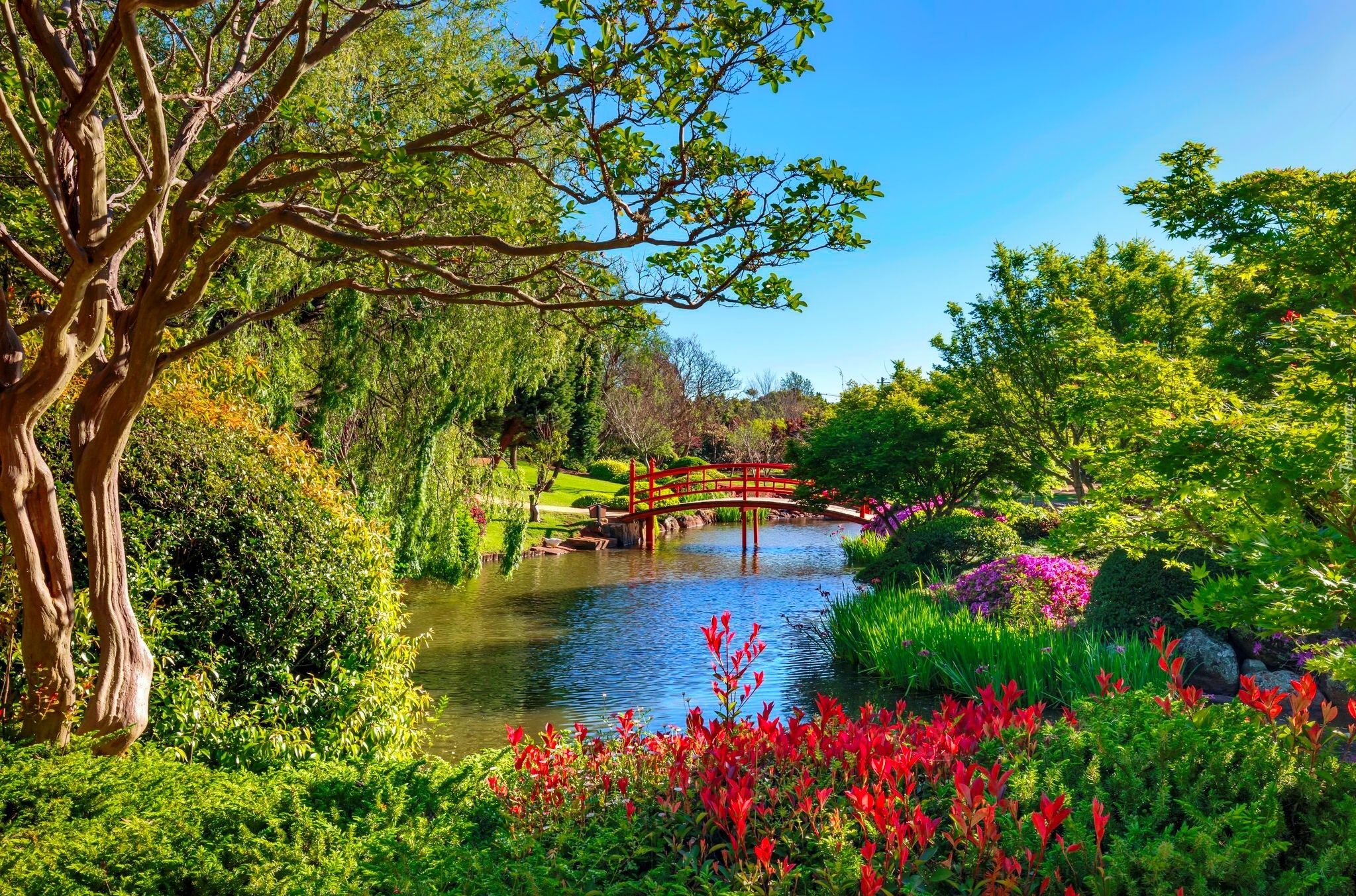 Edytor tapety: Mostek nad stawem w wiosennym parku