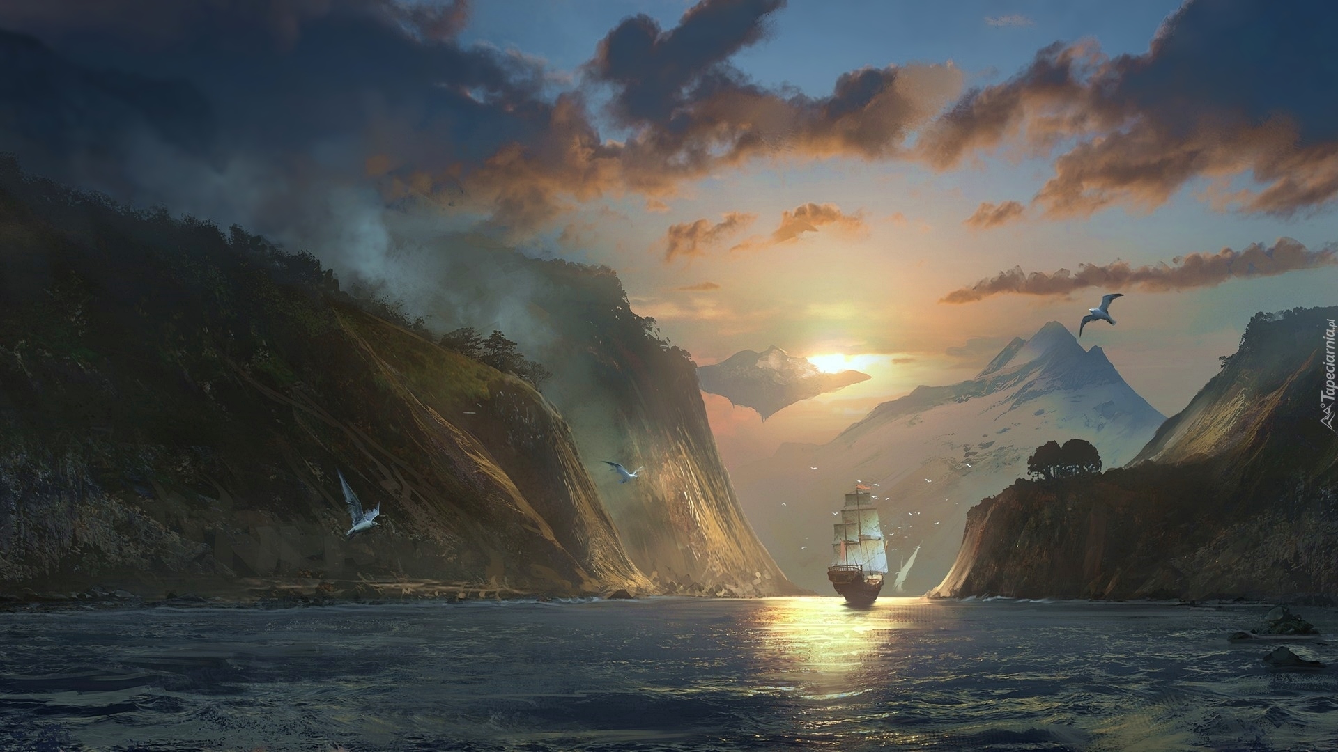 Edytor tapety: Krążące ptaki nad żaglowcem na morzu między górami