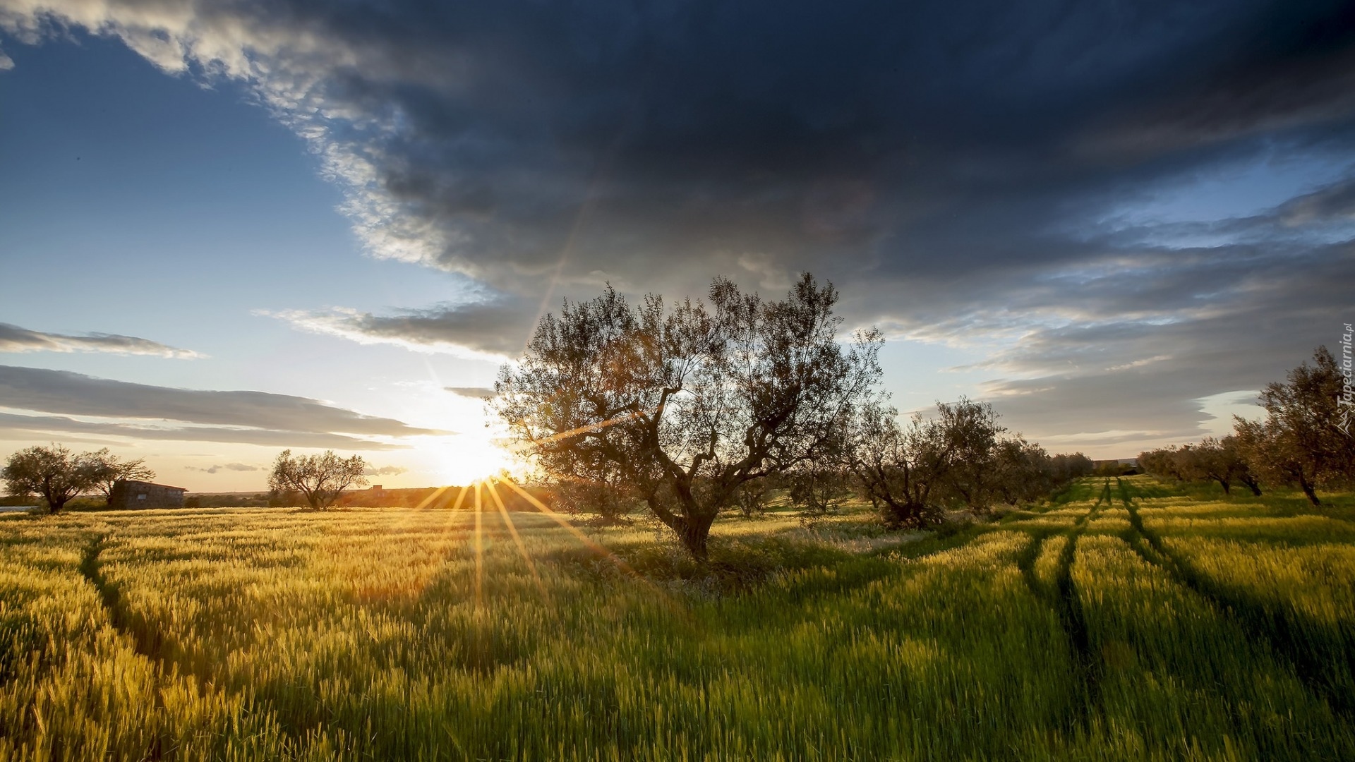 Edytor tapety: Promienie słońca oświetlają pola w gminie Viterbo