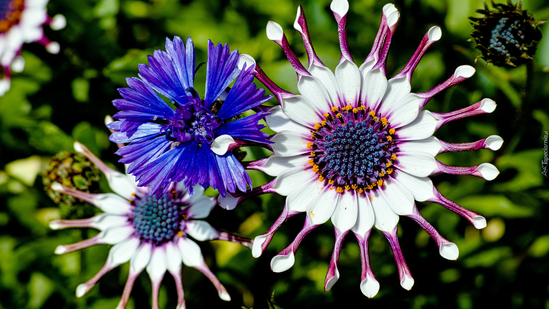 Edytor tapety: Rozświetlone kwiaty stokrotki afrykańskiej i chabru