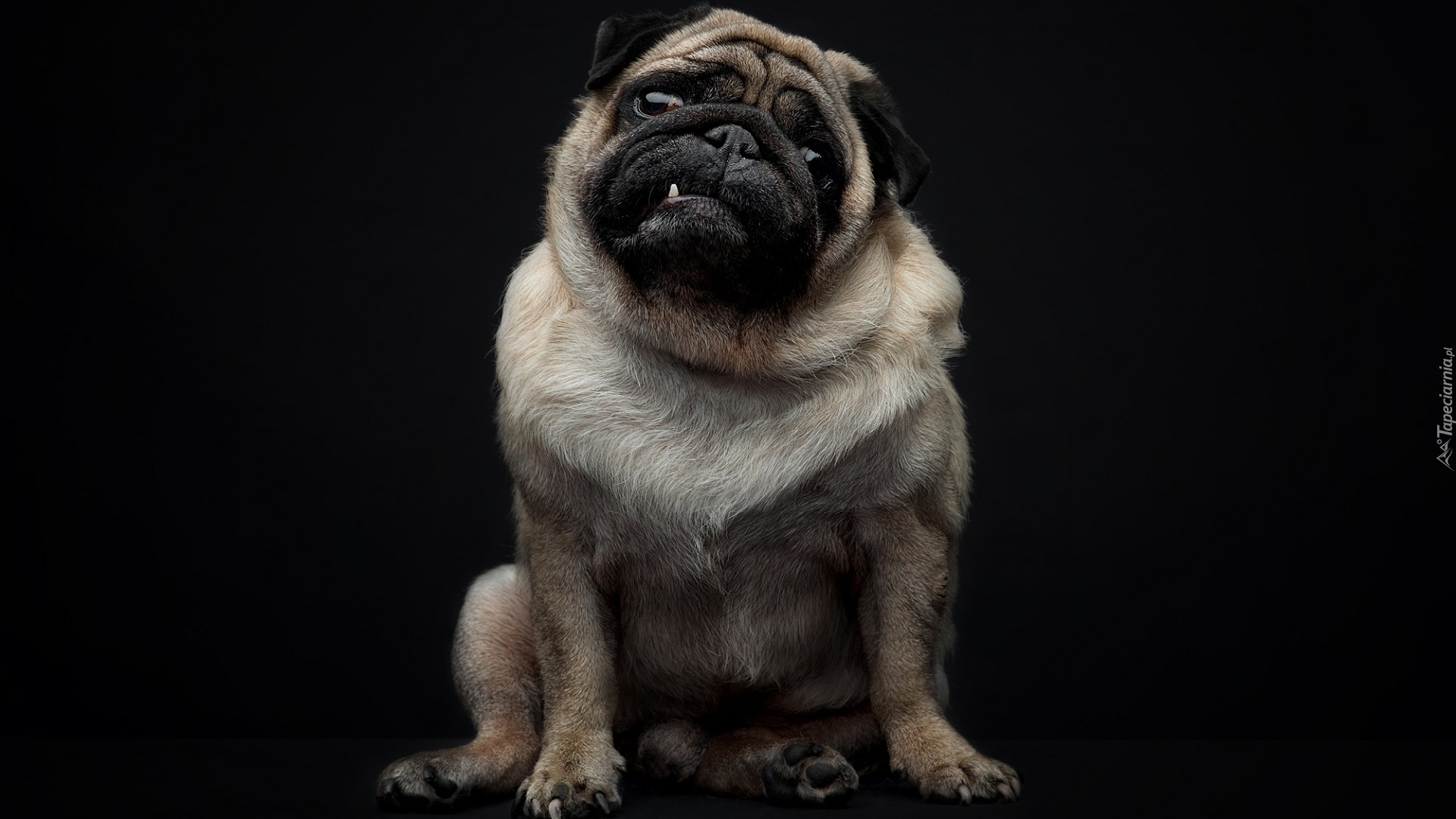 Edytor tapety: Mops z pocieszną miną na czarnym tle