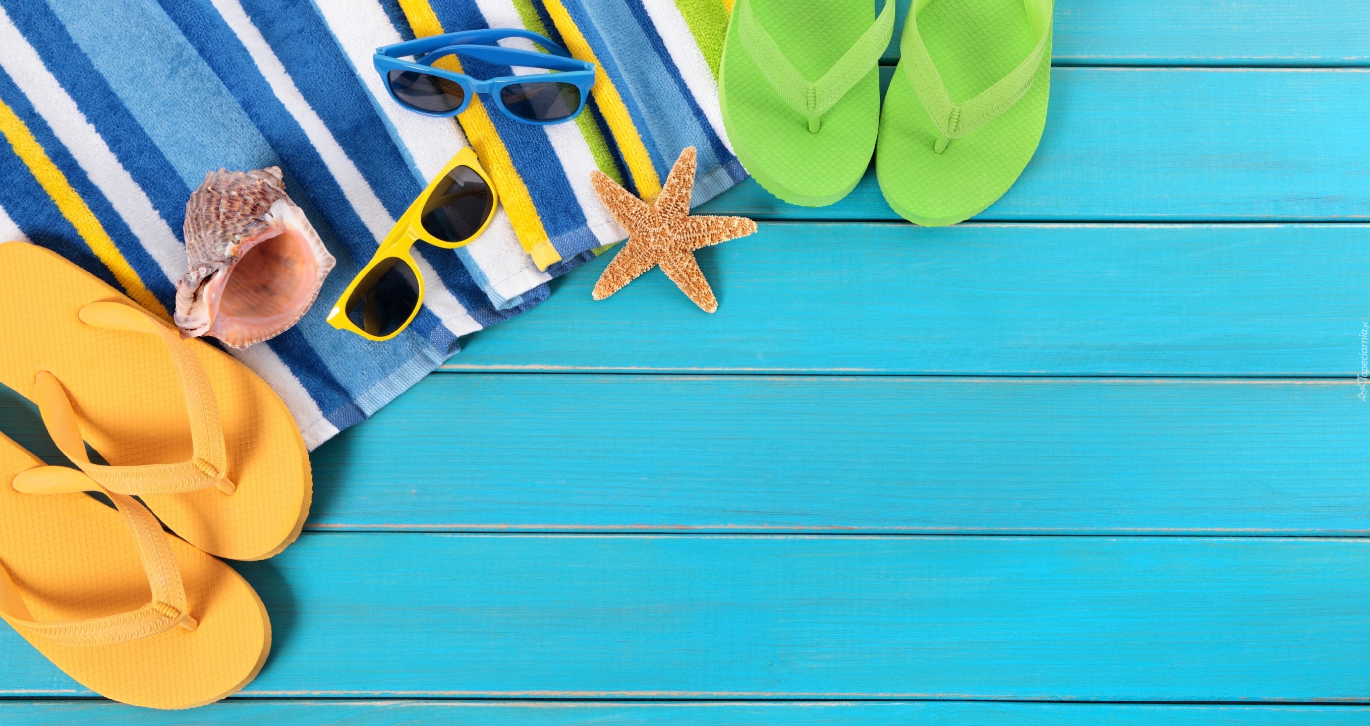 Edytor tapety: Klapki i okulary przeciwsłoneczne na ręcznikach plażowych