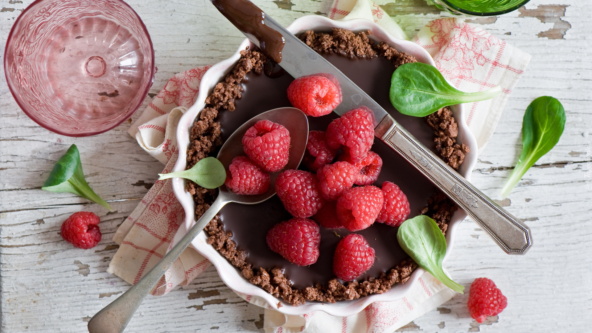 Edytor tapety: Czekoladowy deser z malinami ozdobiony listkami
