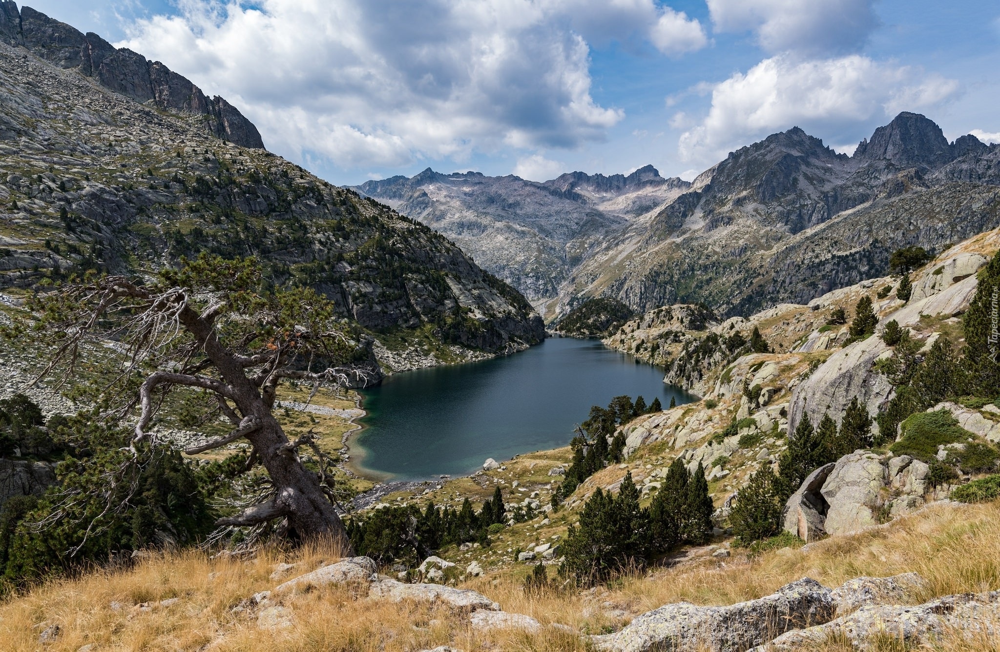 Edytor tapety: Uschnięte drzewo nad górskim jeziorem