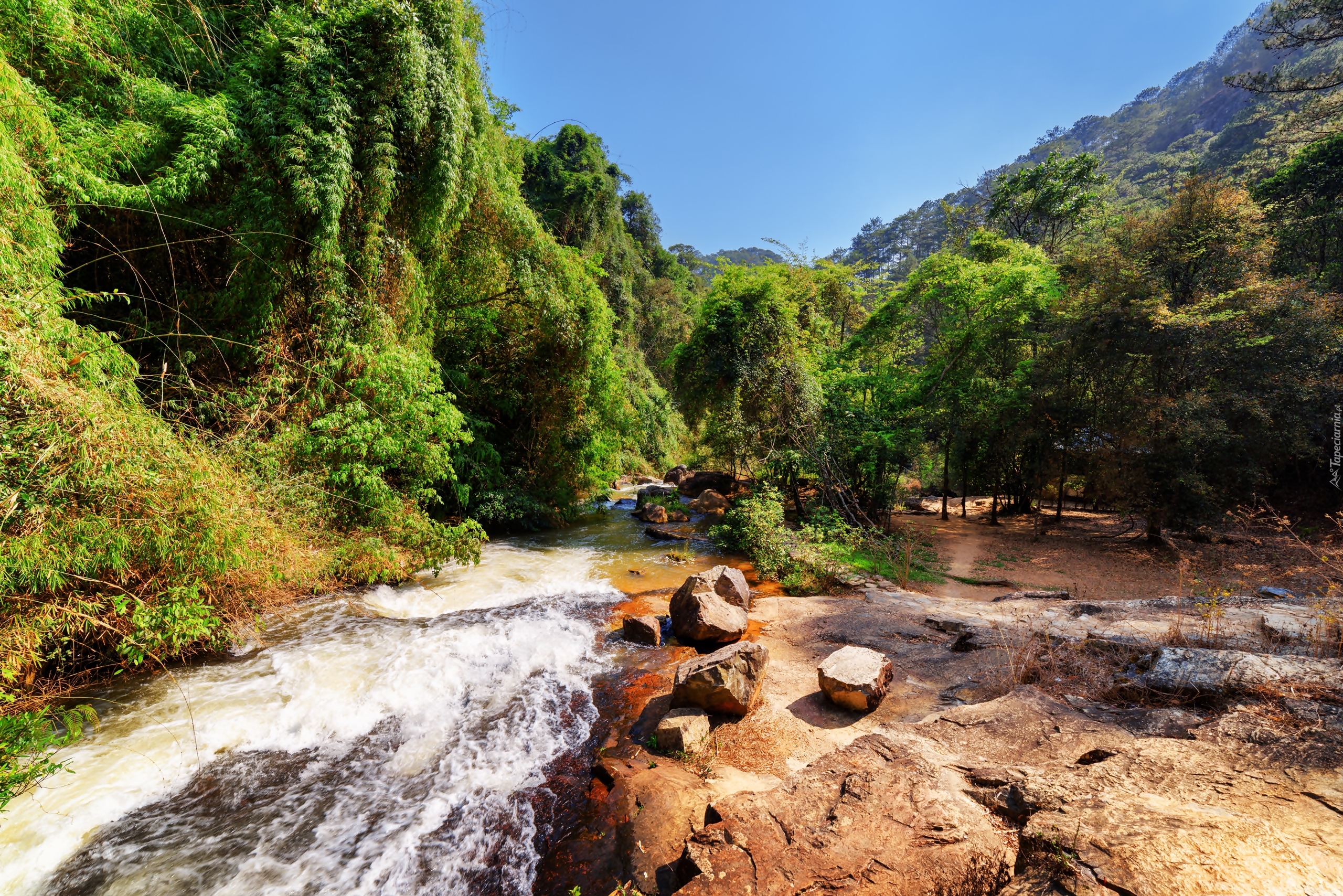 Edytor tapety: Las z potokiem na skałach