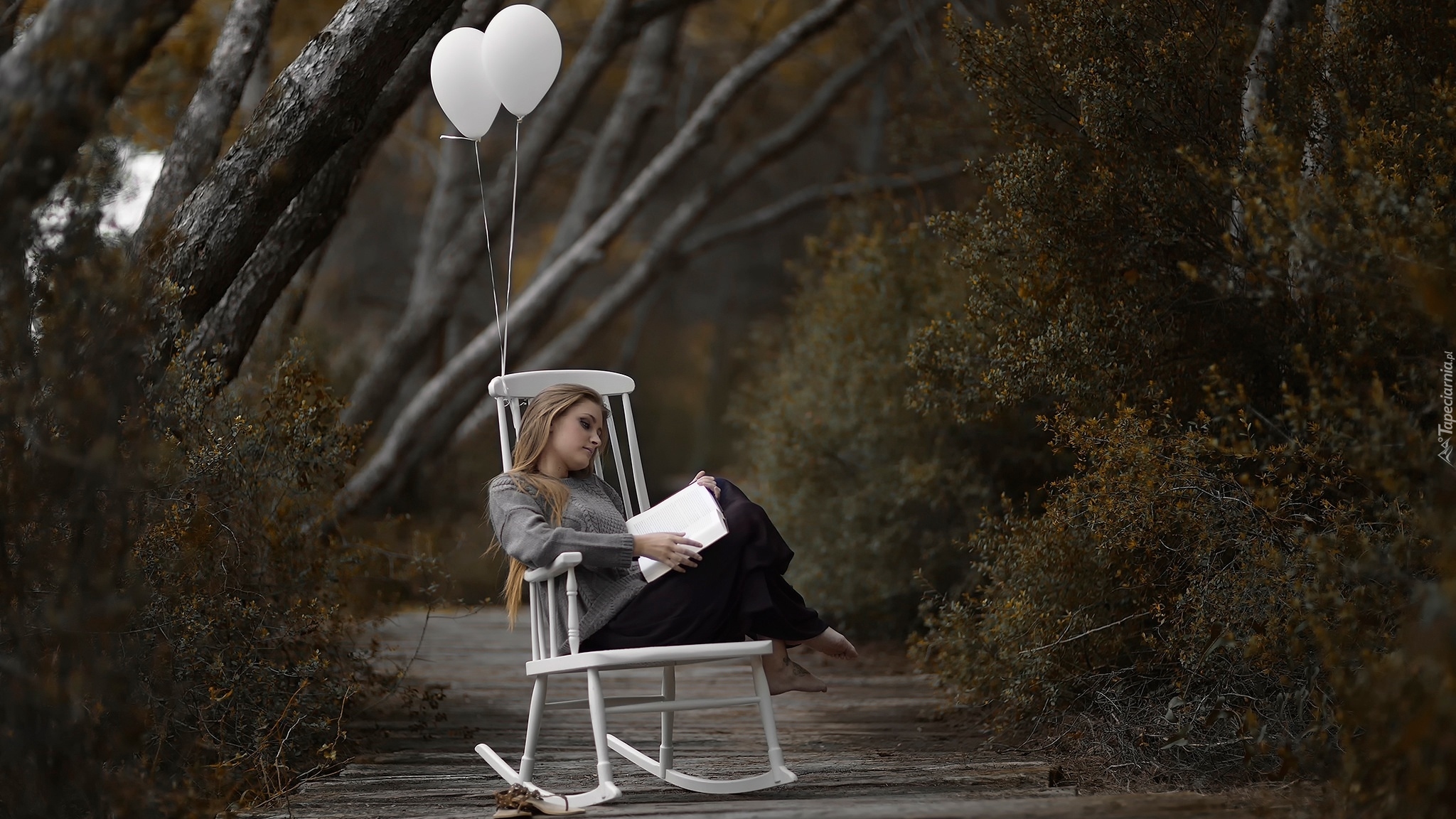 Edytor tapety: Kobieta na fotelu z przyczepionymi balonikami czyta książkę