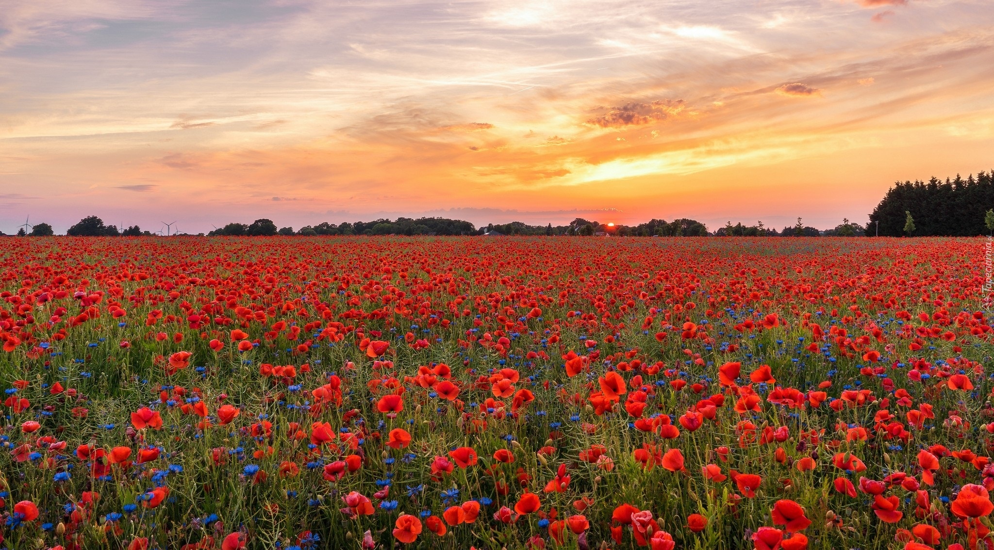 Edytor tapety: Maki i chabry na polu w zachodzącym słońcu