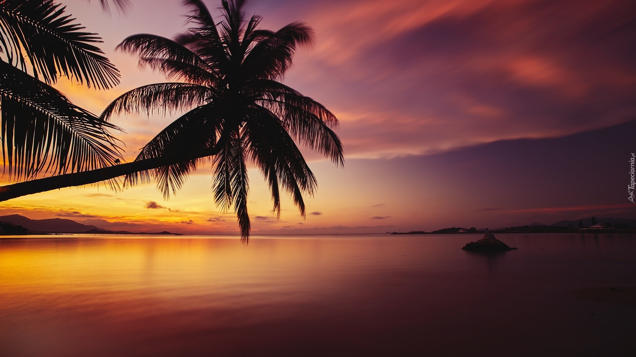Edytor tapety: Pochylone palmy nad morzem o zmierzchu