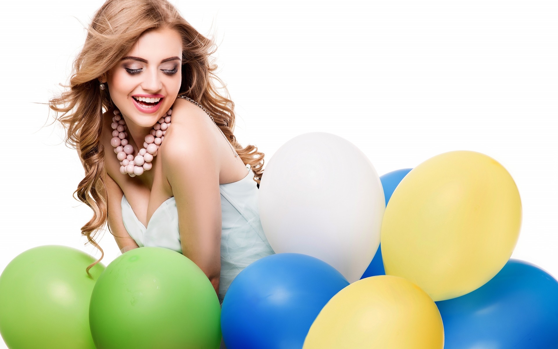 Edytor tapety: Radosna dziewczyna pośród kolorowych balonów