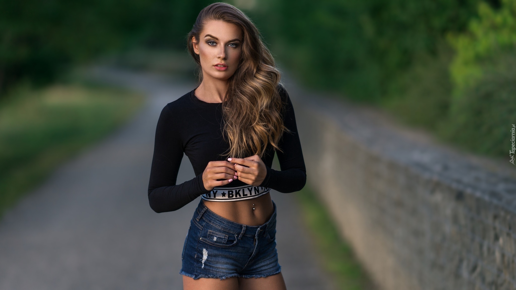 Edytor tapety: Długowłosa dziewczyna w szortach z kolczykiem w pępku