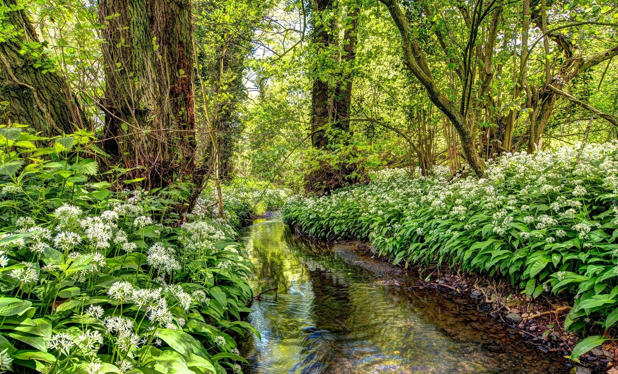 Edytor tapety: Czosnek niedźwiedzi porasta brzegi leśnej rzeczki