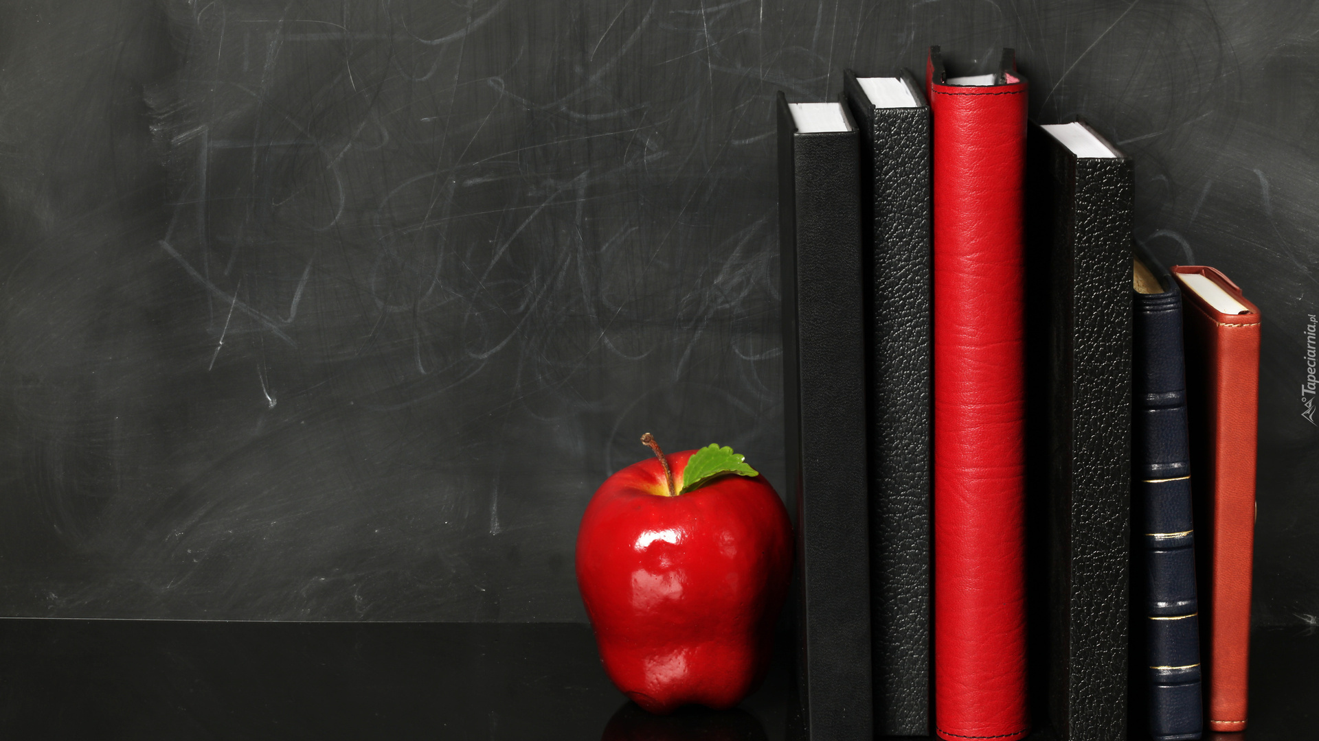 Edytor tapety: Jabłko obok książek ustawionych na półce