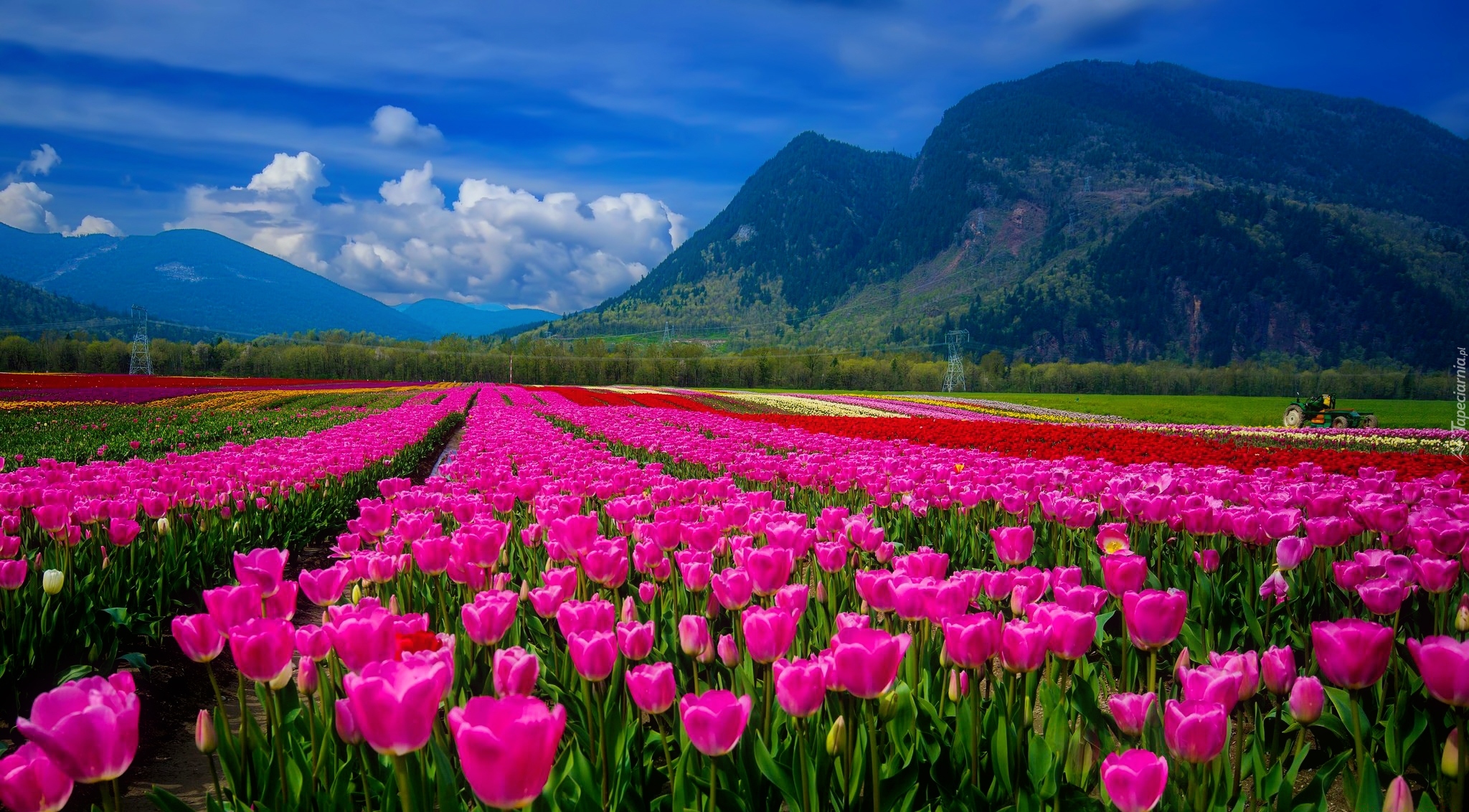 Edytor tapety: Pole kolorowych tulipanów u podnóża gór